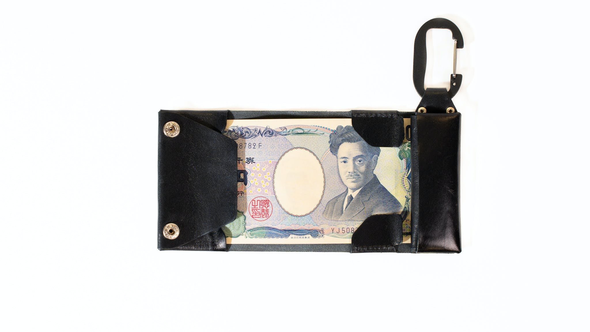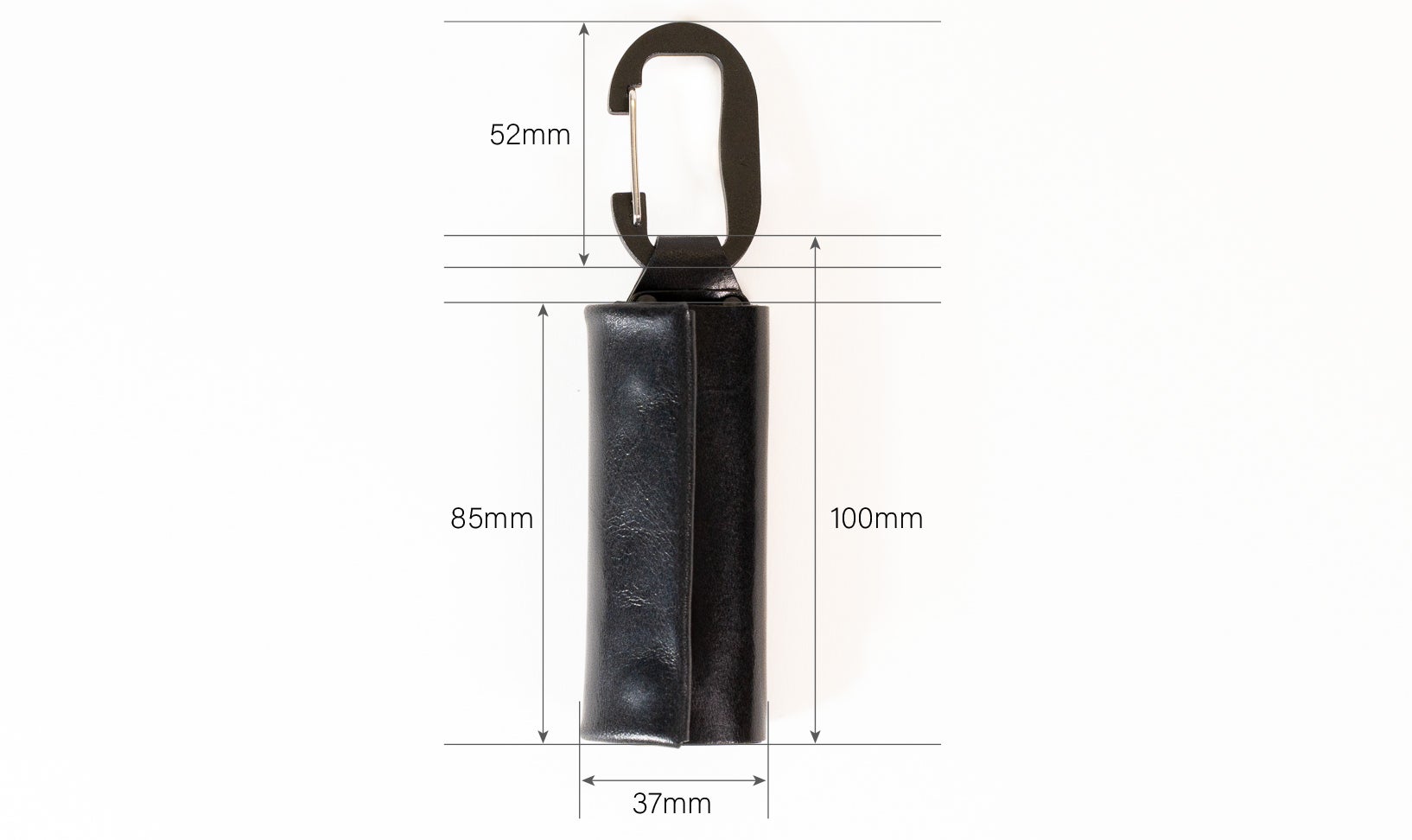 本体は、縦100mm×横37mm(カラビナを除く)とミニマムサイズ。一見するとキーホルダーのようなルックスですが、財布としての機能を持たせるために「カラビナ付き 超ミニレザー財布」には驚くほどの技術とノウハウが詰め込まれています。