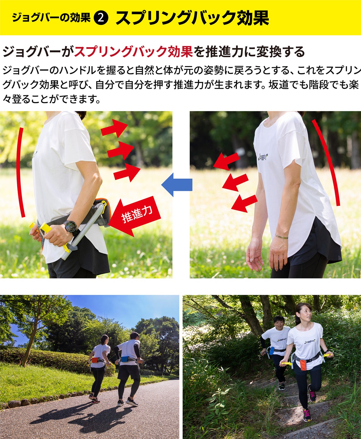 江戸時代の日本人は1日30キロ以上歩いて旅をしていました。ジョグバーの発明者もジョグバーの試作品のテストで大阪~東京500㌔歩き旅を21日間で完歩しました。 ジョグバーは自分で自分の腰を押すスプリングバック効果や使用中に姿勢を良くする効果もあり、一度使うと手放せなくなるアイテムです。 公園などのウォーキングはもちろん、山登りやハイキング、軽いジョギングなどにも使用できます。健康的でカラダに負担の少ない理想的な歩き方を身につけることができます。