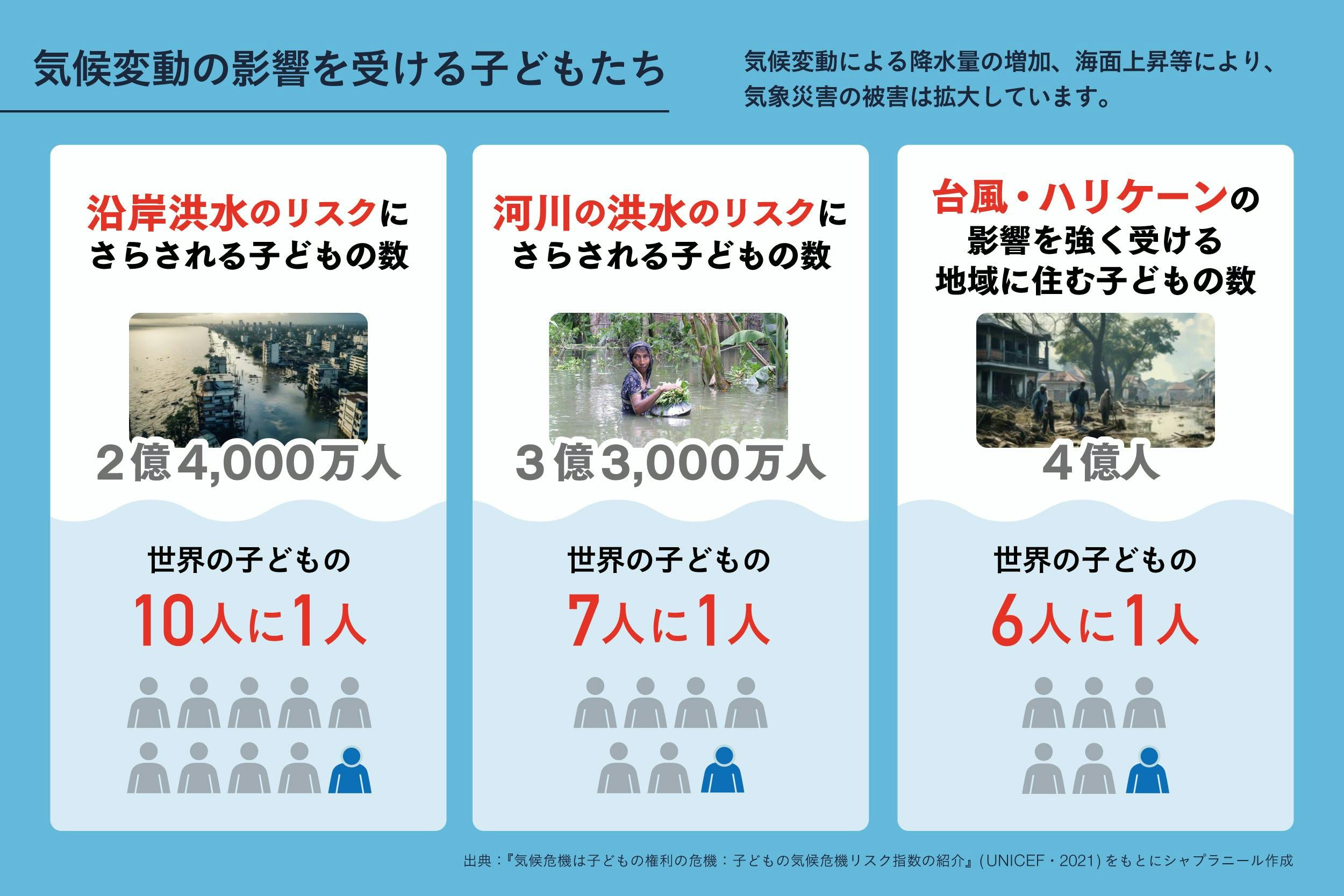 ユニセフによれば、気候変動の影響を受けるリスクが「極めて高い」とされている子どもの人数は約10億人。これは世界の子どもの半数にもあたる人数なのです。