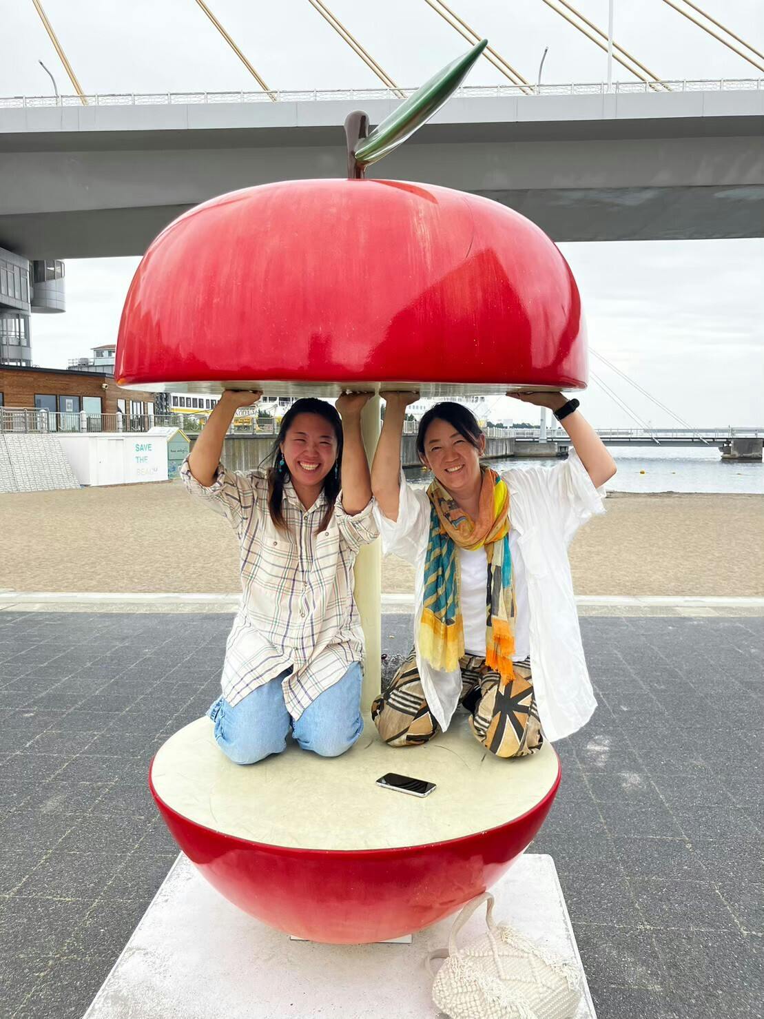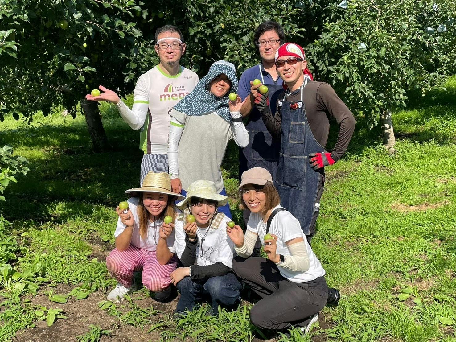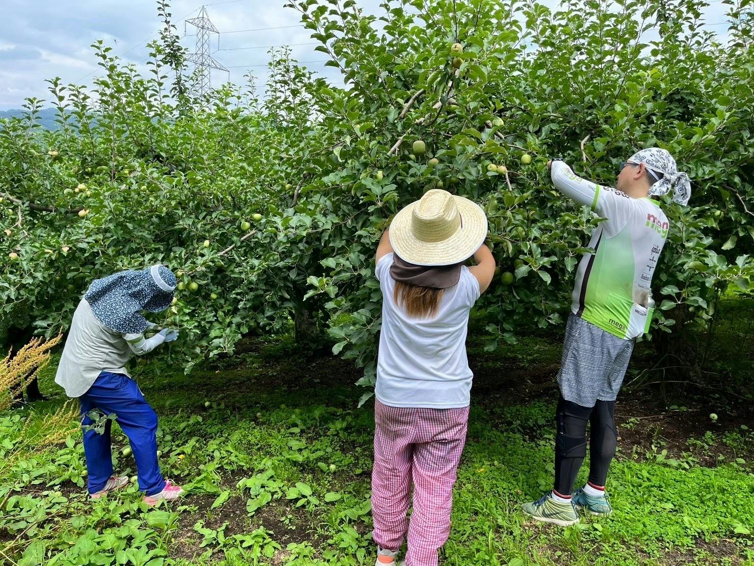 そんな出会いからわずか3か月後の7月に、カルコラーレさんは青森まで来てくださいました。一緒にりんご園の中で農作業を手伝ってくださり、りんご作りを体験して頂きました。