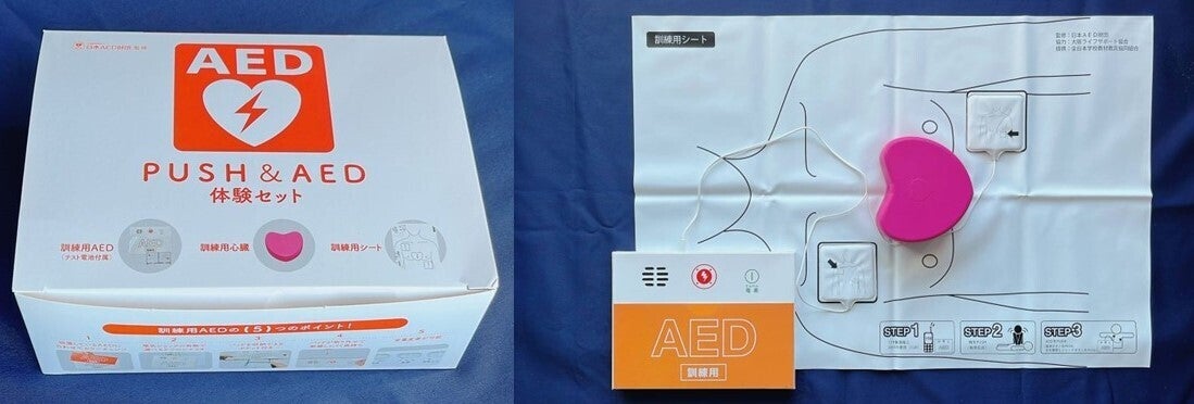 「PUSH体験&訓練用AED」を全国の学校、施設、スポーツ団体など子どもたちがいる場所へ届けられるセットを用意しています。