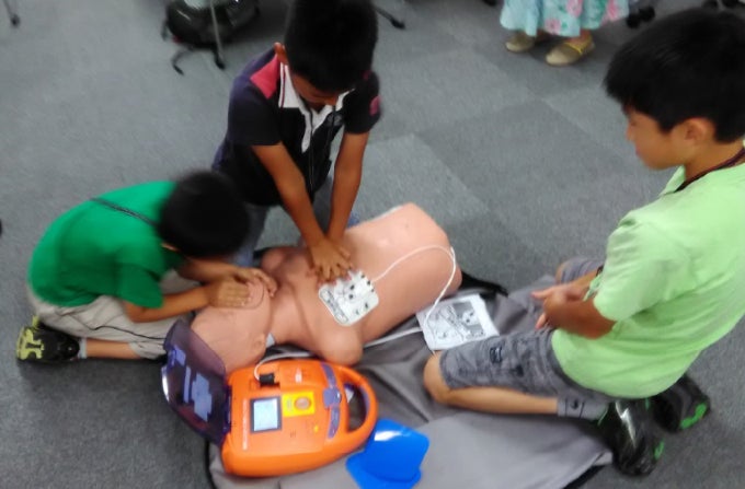 胸骨圧迫とAEDの取り扱いを子どもたちに教えることは、命を救うための貴重なスキル習得となります。