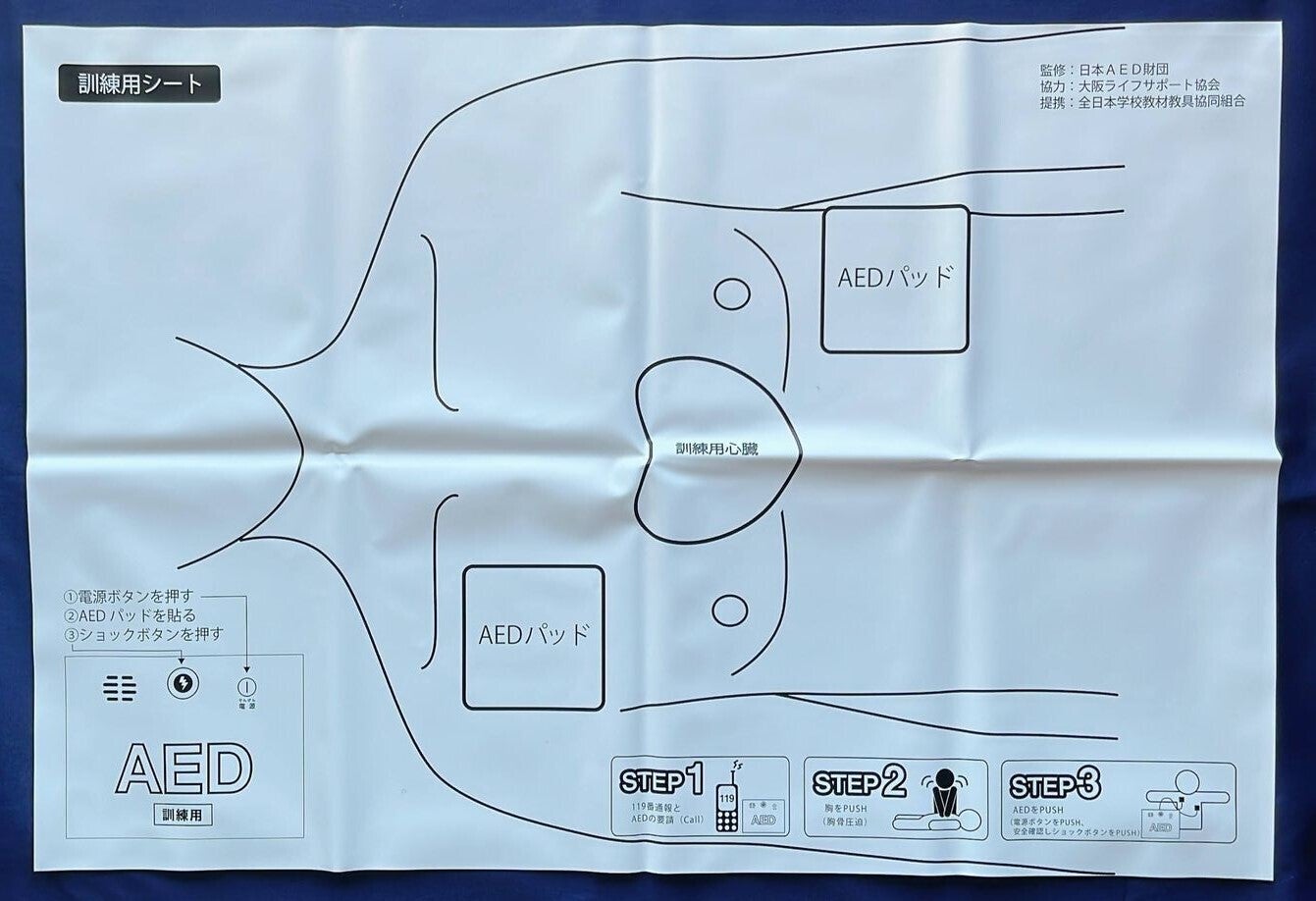 ポイント④:訓練用シートは学習机に合ったサイズのシートにAEDがプリントされています。訓練用シートと訓練用心臓だけでも効果的な体験が可能です。