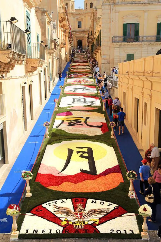 「インフィオラータ(花絵)」とは、イタリア語で「花をまく」という意味の、400年以上続くイベントです。市民が教会までの道のりを花や種子等で宗教画を描くもので、イタリアやスペインを中心に世界各国で現在も盛大に行われています。