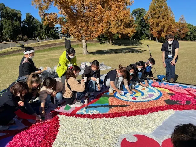 当日の花絵制作や前日の花むしり(ペタリング)の作業では関西大学や大阪大学の学生が参加し、沢山の人の協力で1枚の大きな花絵が出来上がり万博記念公園を訪れた多くの方たちの心を惹きつけました。