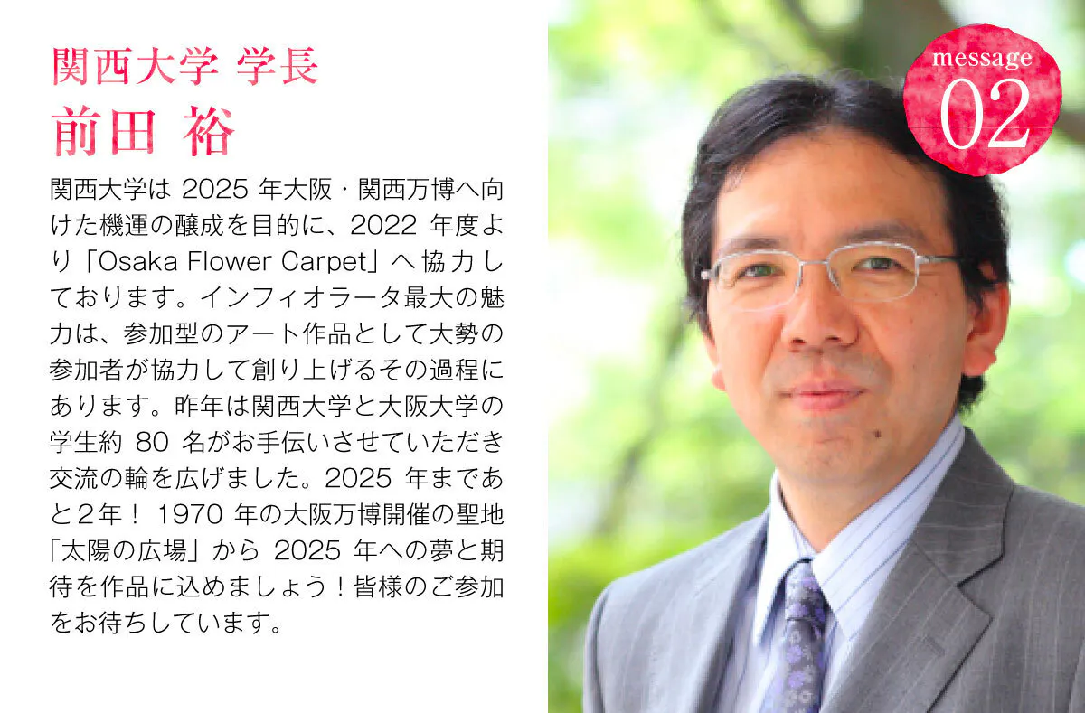 大阪府吹田市の太陽の塔前広場をキャンバスに花びらで絵を描く「インフィオラータ」の花の力と地域の力を合わせ、まちに彩りと笑顔を届けるために、「Osaka Flower Carpet 2023」を開催します!