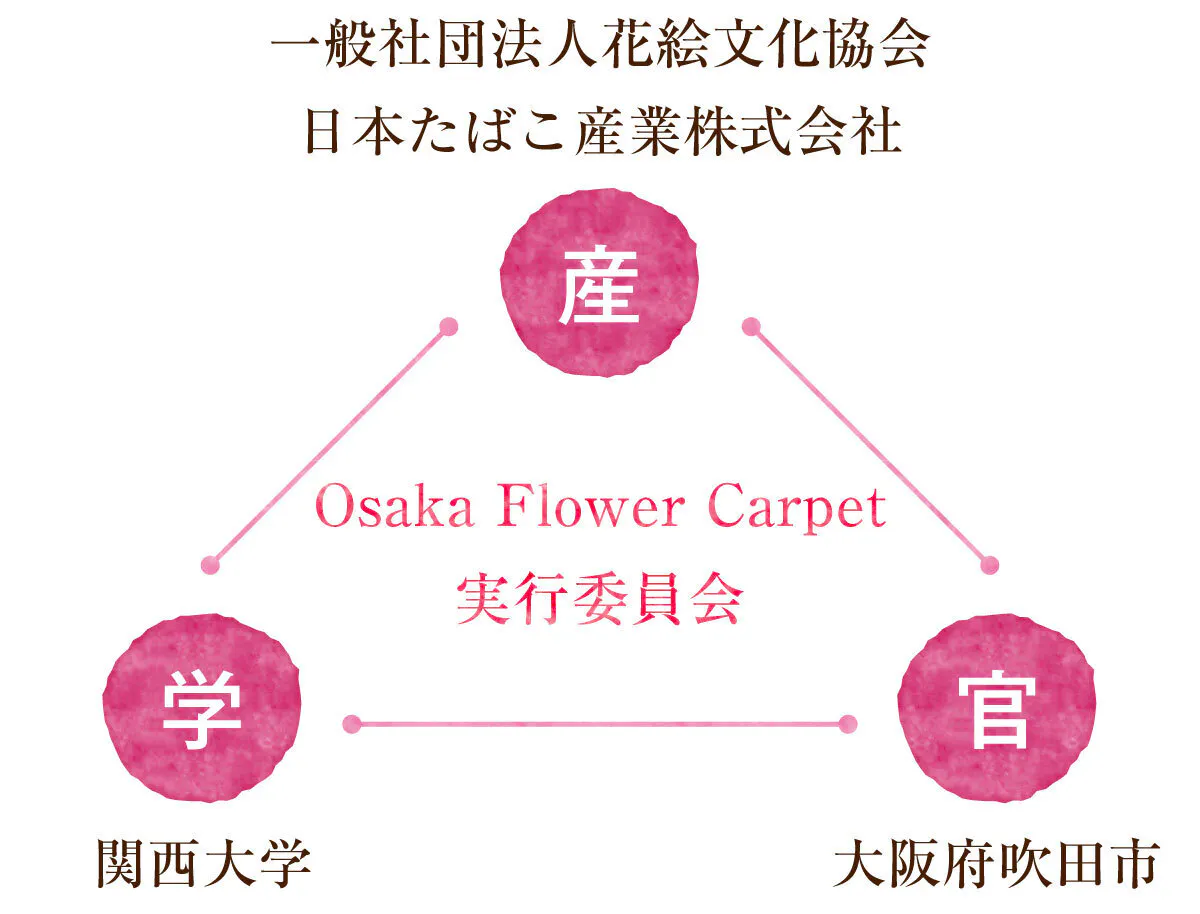 私たち「Osaka Flower Carpet 実行委員会」は、一般社団法人花絵文化協会の取り組みである「インフィオラータ(花絵)」を通して、地域を盛り上げていきたい!と集まった産学官の連携で結成したプロジェクトチームです。