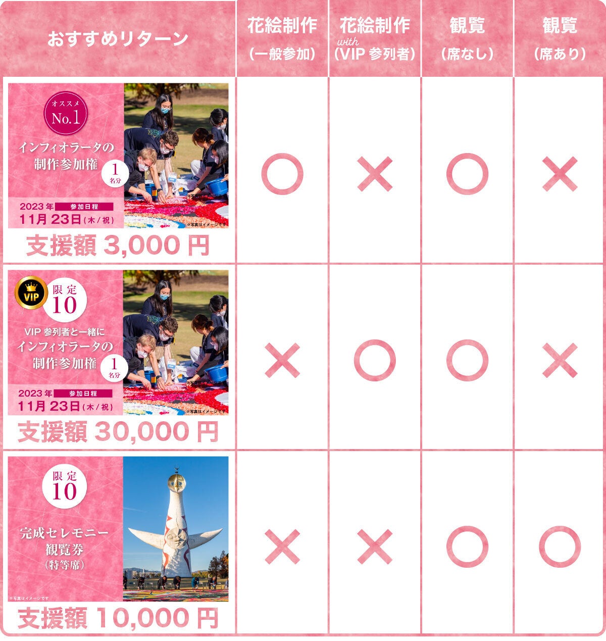 今回のクラウドファンディングで、特におすすめのリターンは、実際にイベントに来ていただき、参加者同士の交流・繋がりをつくれる以下の3つのリターンです。