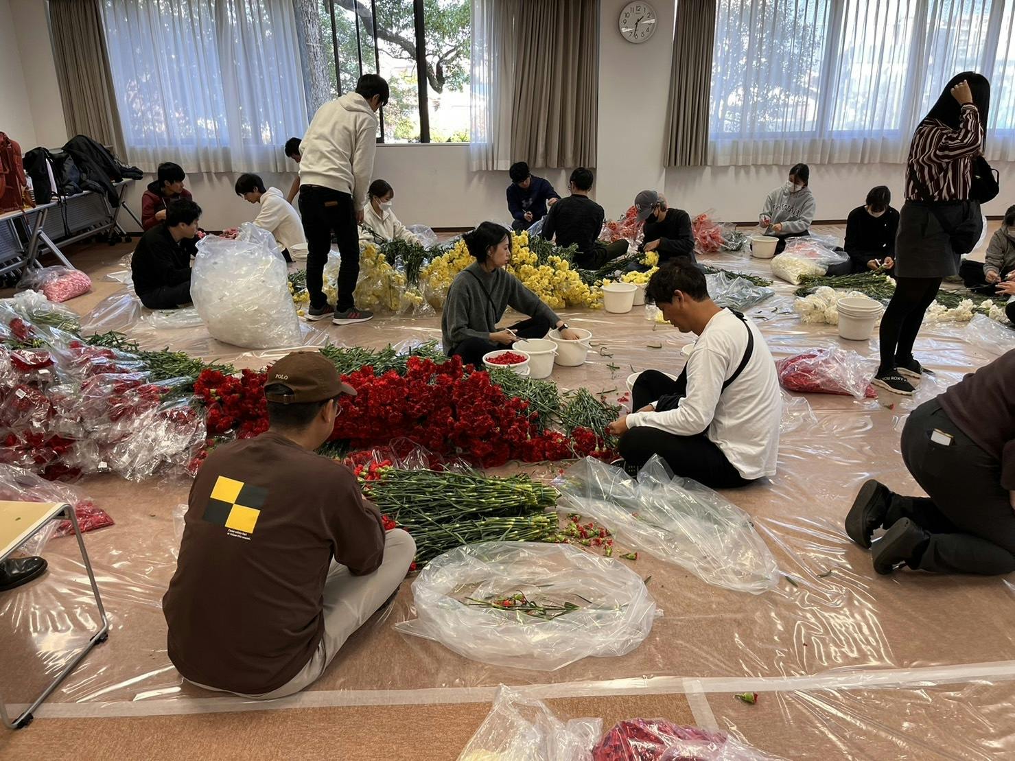 2023/11/22 18:22こんにちは。OsakaFlowerCarpet実行委員会です。いよいよ明日、花絵製作イベント開催!今日は明日使う花の準備「ペダリング」を行いました。茎から花びらだけを外す作業です。約2万本もあった花を皆で黙々と分けていき無事に明日を迎える準備が出来ましたよ。制作で参加される皆さん!どうぞよろしくお願いします。皆様のご来場を心よりお待ちしております。 もっと見る