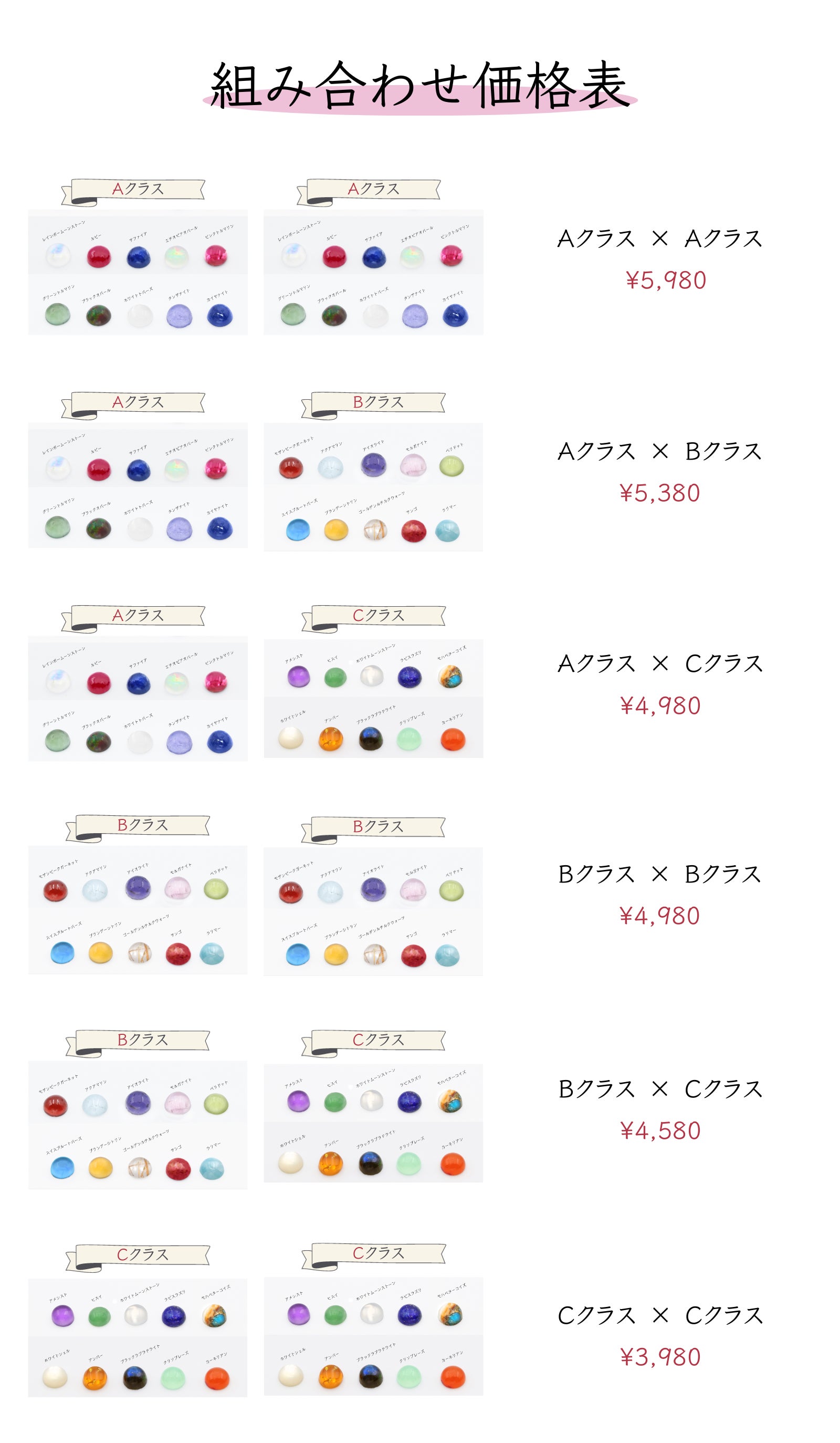 色の組み合わせは「石の意味」や「好きな色」でお選びください。ラッキーカラーや、誕生石、透過性のある石だと光が透けて2色の色がグラデーションのように交じり合って見えたりするので、色のハーモニーでお選び頂くのも素敵ですね。