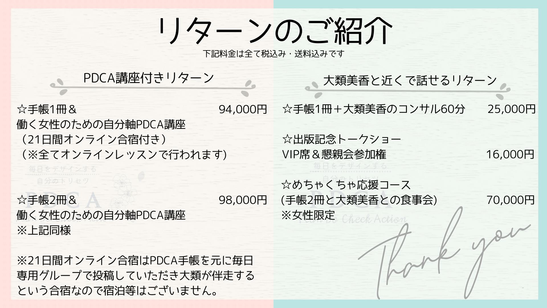 2023/11/14 11:49みなさん、こんにちは!毎日をデザインする自分のトリセツPDCA手帳の開発者大類美香です。初めてのクラファンを開始するとき手が震えたことは鮮明に覚えていますが夢だった手帳製作を叶えるためには必要な道だとわかっていながらも不安は山ほどあるでもここであきらめるわけには行かない!そんな気持ちでクラファンスタートをさせて早くも24日がたちました。1stゴールを達成したときこんなにたくさんの方が応援してくださっている。これは夢かしら??という気持ちでいっぱいでしたが次に立てた目標の2ndゴールである150万円もなんと・・・/おかげさまで達成いたしました!!!\本当に本当にありがとうございます。スタートして最初の頃は、元々の知り合いの方がたくさん支援してくださっていましたが時間の経過とともに「初めまして。」の方からもご支援をいただけるようになり全国的に知名度ほぼ0の私でもここまで来ることができること想いに共感してくださっている方がこんなにもいらっしゃるという現実を日々、実感しております。これからチャレンジしたい!という方々にこんな私でもここまで出来たよ!という背中を少しでも見せられたのかな。スタート前には決して見ることができなかったこの景色。そして残り14日かけてさらに広がる新しい景色。この期間を通じて、みなさまからいただいたすべての経験や気づき、学びの数々。まずはリターンの残席2名さまとなりました東京のサンクチュアリ出版様での出版記念トークショーでお話させていただきます!もちろんその他の場所でもお話させていただきますのでこれからも大類美香をあたたかく見守っていただけると幸いです。「え?!こんなことってあるの??」と、目がテンになるようなことが起こる初めての手帳製作ですが着々とページが出来上がっております。ご支援の中でも断トツ人気のPDCA手帳はイラストVer.がNo1です!この中身のイラストも公開できるようになったらお知らせさせてくださいませ。みなさまおひとりおひとりのご支援のおかげで今、ここにいることができています。心から感謝申し上げます。引き続きよろしくお願いいたします。みなさんの事が大好きです。※こちらの文章はブログライティング講師&告知分ライターの松本あゆみさんのご支援をいただきながら私の想いを載せて書かせていただいております。 もっと見る
