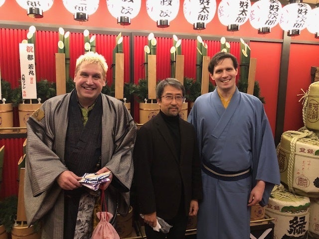 今回の企画をしている電脳和風です。(”でんのうさん”と呼ばれています。)私は日本の伝統的な文化である歌舞伎や落語に深い敬意を抱いています。ロックとオペラしか知らなかった私がイギリスから帰国したとき、日本の歌舞伎の舞台に衝撃を受けました。それからというもの、この素晴らしい文化を若者や海外の人々にも広めたいという思いを抱き続けています。私のYouTube”電脳和風 Cyber-JP”は、歌舞伎ファンのYouTuberとしては、日本一のチャンネル登録者数です。歌舞伎以外に、独り芝居の要素もある外国人落語家の落語会も主催しています。(呉服座で開催した”世界初の外国人落語家2人会”の際の、下の真中が私です。左はカナダ人落語家の桂サンシャインさん、右はスウェーデン人落語会の三遊亭 好青年さん)