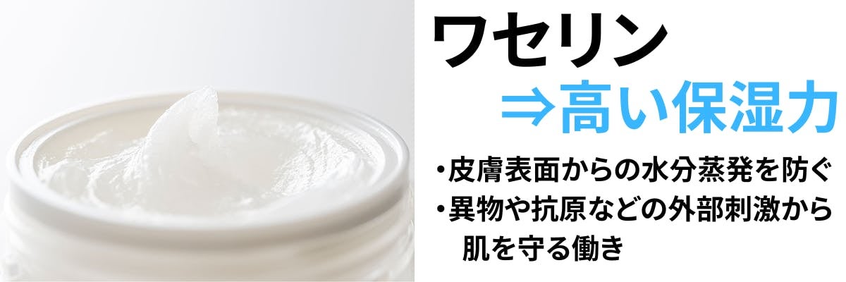 - ワセリンは保湿効果が高く、皮膚表面からの水分蒸発を防いでくれるほか、異物や抗原などの外部刺激から肌を守る働きも有しており、私たちの日常に古くから親しまれています。