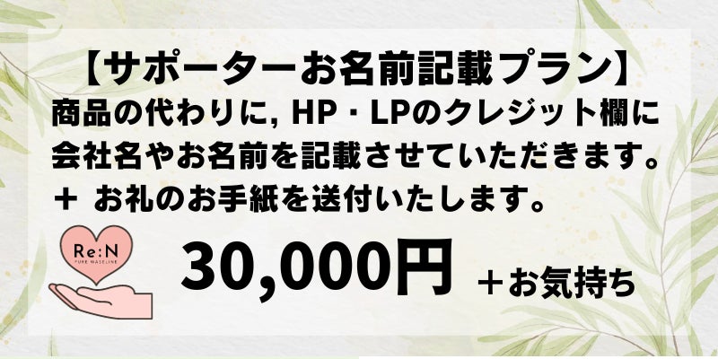 ・HP・LPにお名前を記載させていただきます。+ 感謝の気持ちを込めてお礼状をお送りします。30,000円(送料無料)