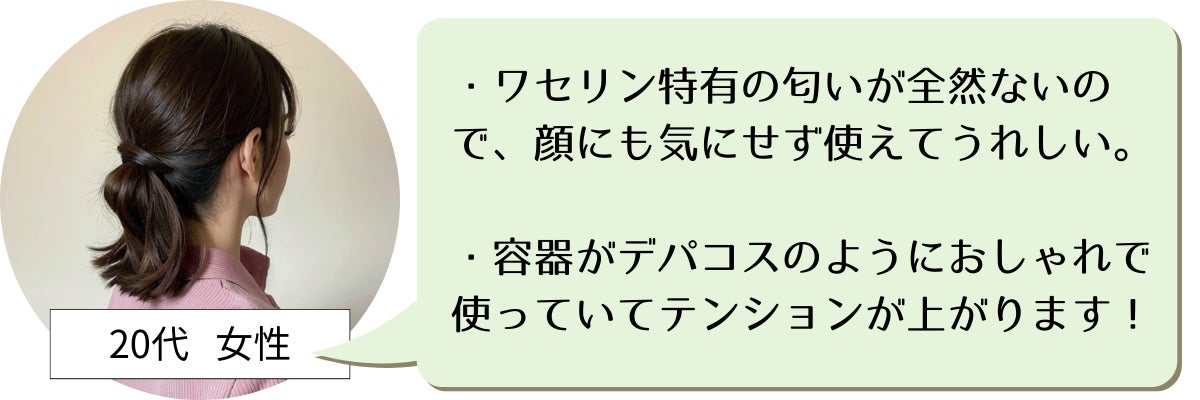 - しかし、その反面「使用後にべたつく」「ワセリンの独特な匂いが苦手」というような、既存のワセリンに対する不満を感じたことのある方も少なくはないのでしょうか。