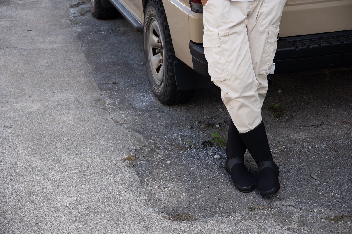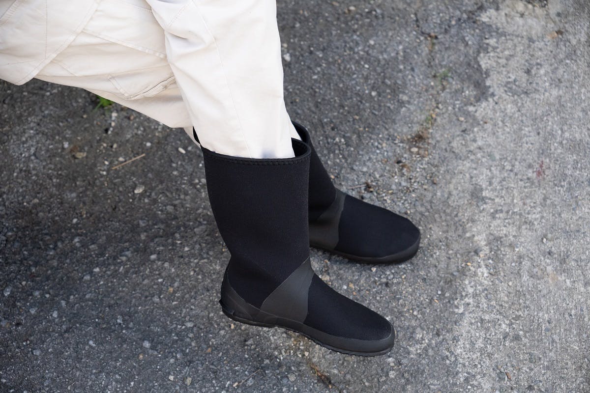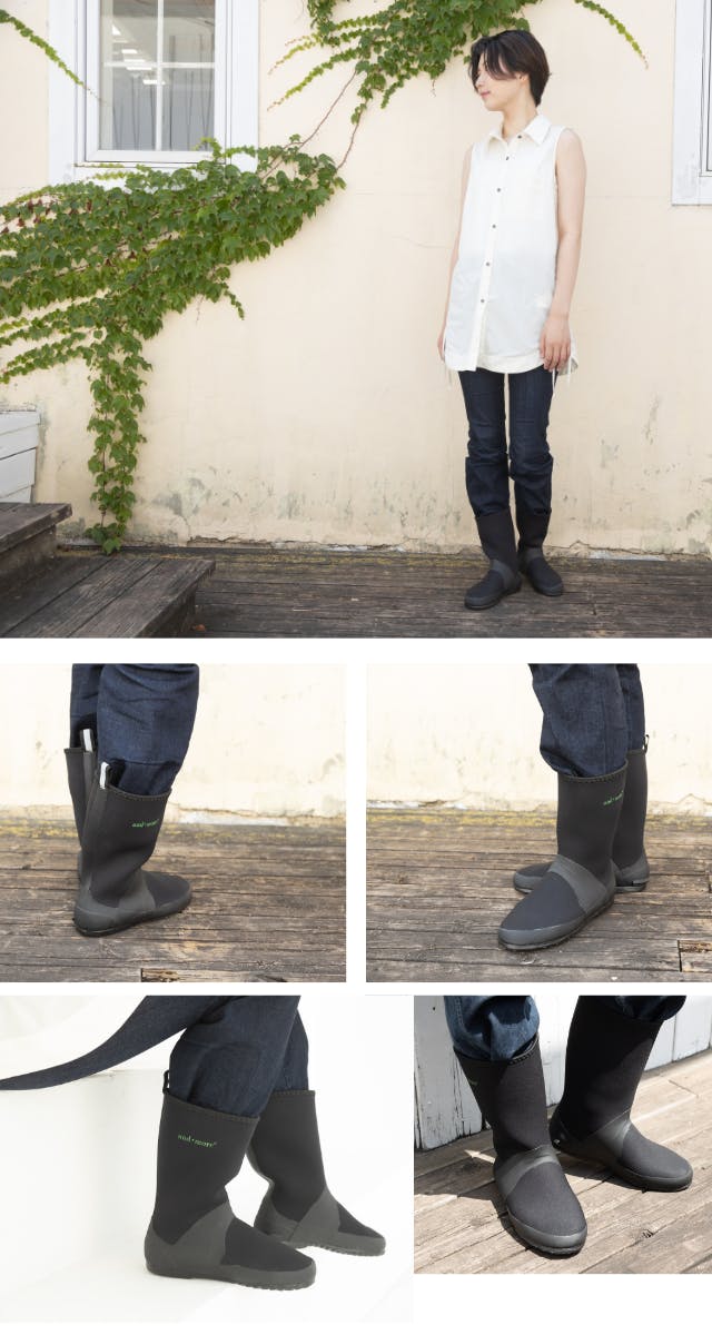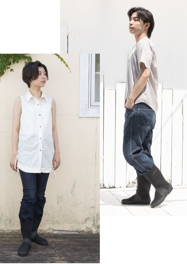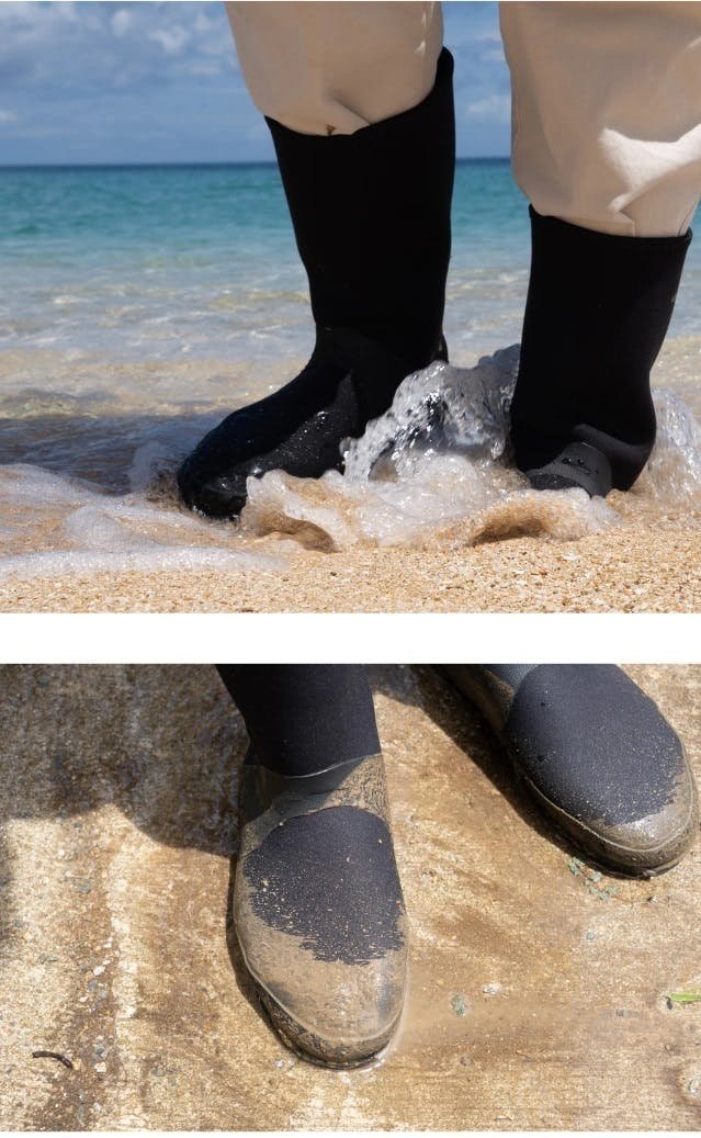 たった4mmのダイビングスーツ素材が、悪天候や悪路でも足元を快適に! 驚きの防水を実現します。