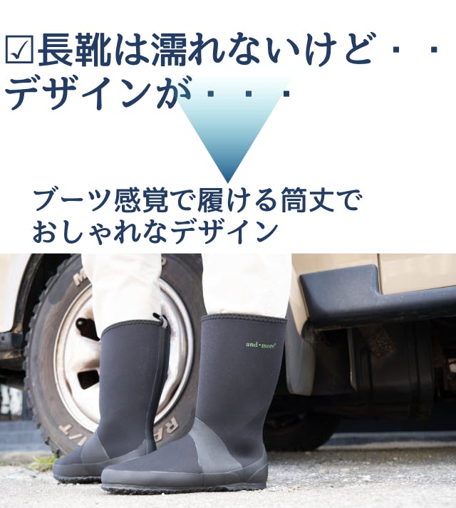この経験からどんな悪天候の時でも対応できる靴を作りたいと思いました。長靴より機動力があって、楽に履けて安全に履ける防水ブーツを企画し誕生しました。