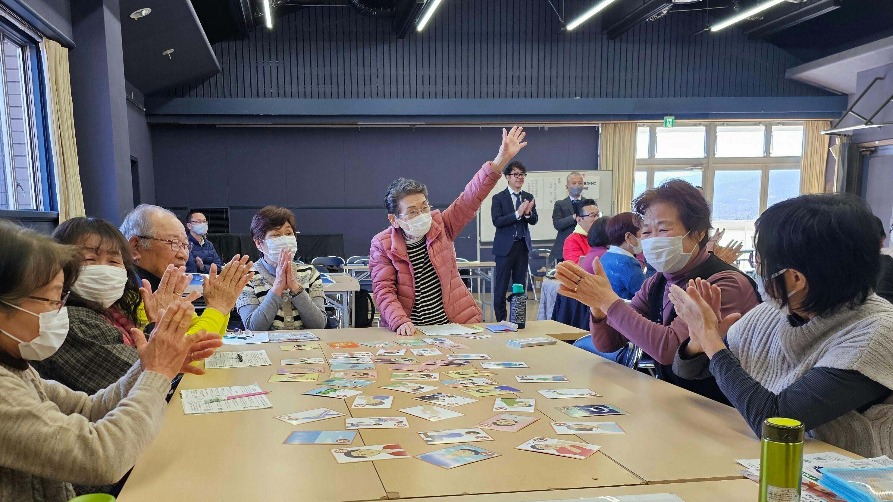 この「喉トレ健康かるた」は何度も何度もデモを行い、多くの方に喜んでもらってきました。デモ参加者のシニアの皆さんから「面白いわ〜」「今日来て本当によかった」「この年でお友達ができるなんて...嬉しい!」そんなお声を沢山いただき、自分達で楽しんで介護レクができるアイテムとして、大きな手応えを感じています。