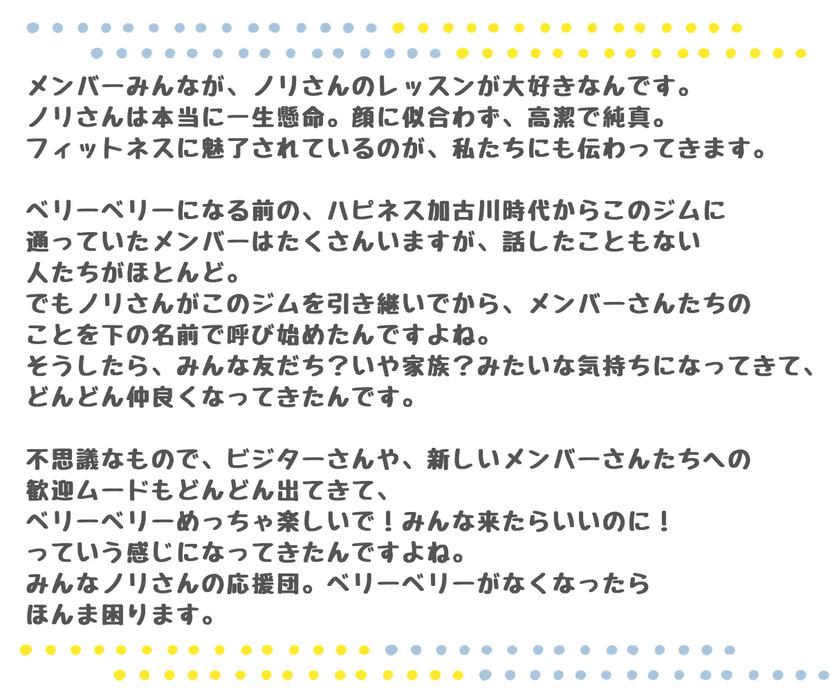 もう、今これ書いてたらまた泣けてきました……。普通のジムでは⾒ることの出来ない非日常かと思うくらいの優しさ、温かさを感じられる空間や⼈が、僕にとってのベリーベリーです。だから、どんなに経営が厳しくても、ベリーベリーを継続させるためにバイトが続いても、毎日が楽しいんです!