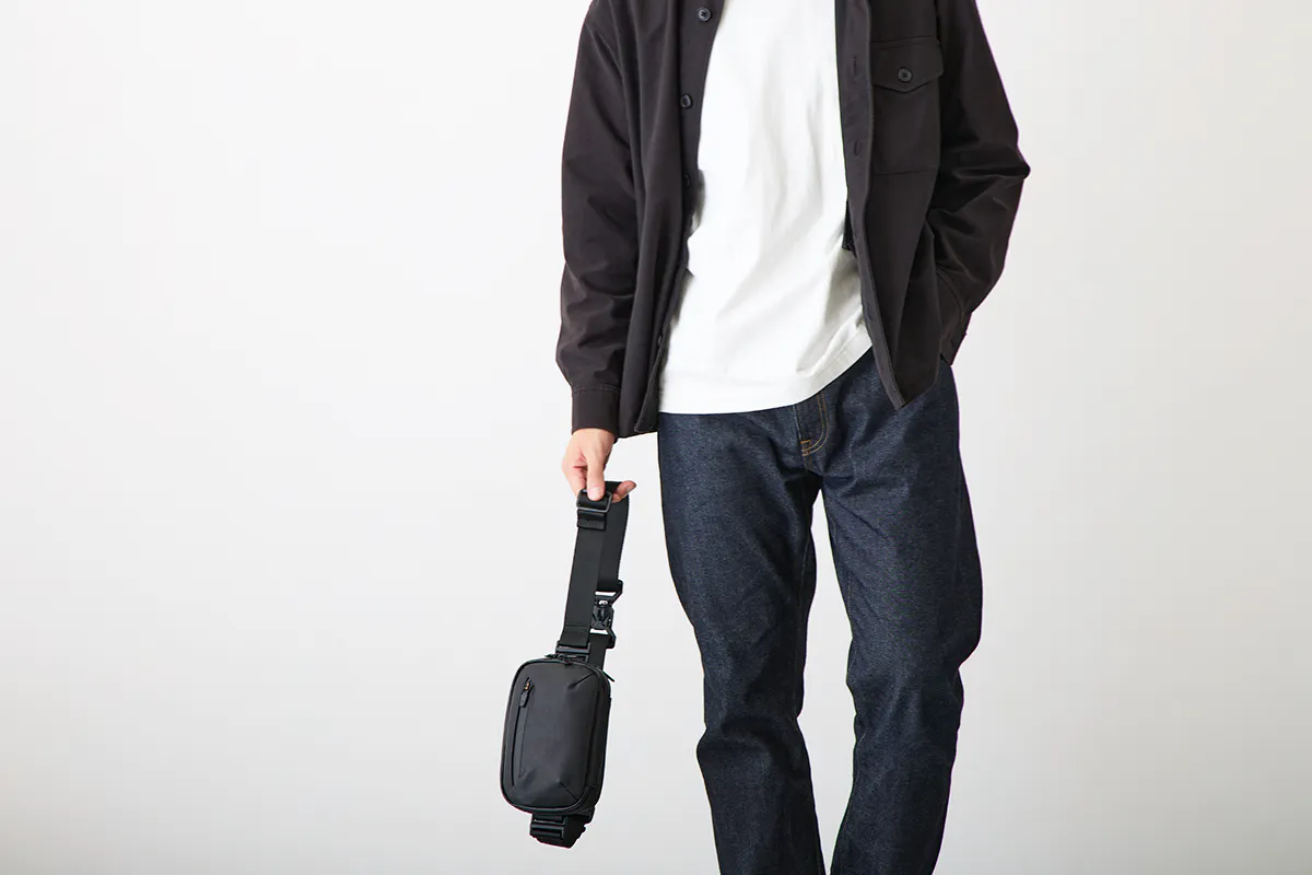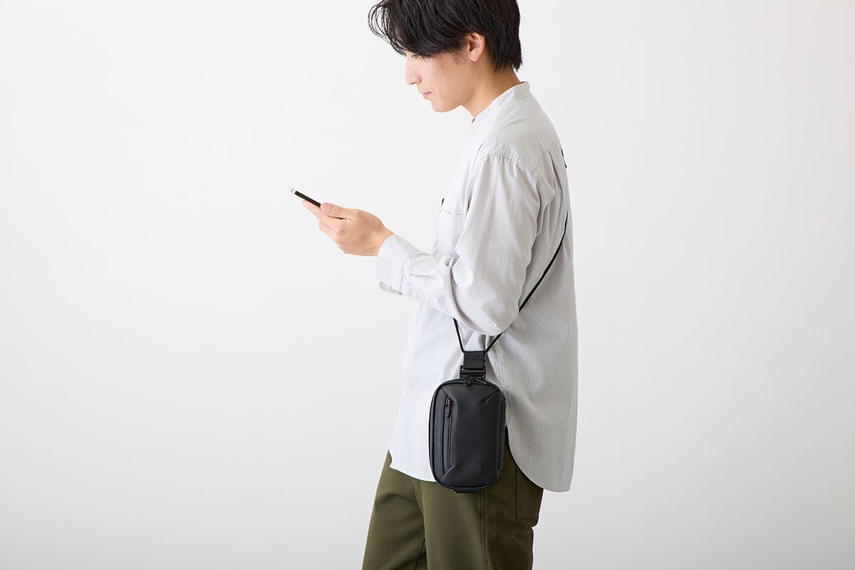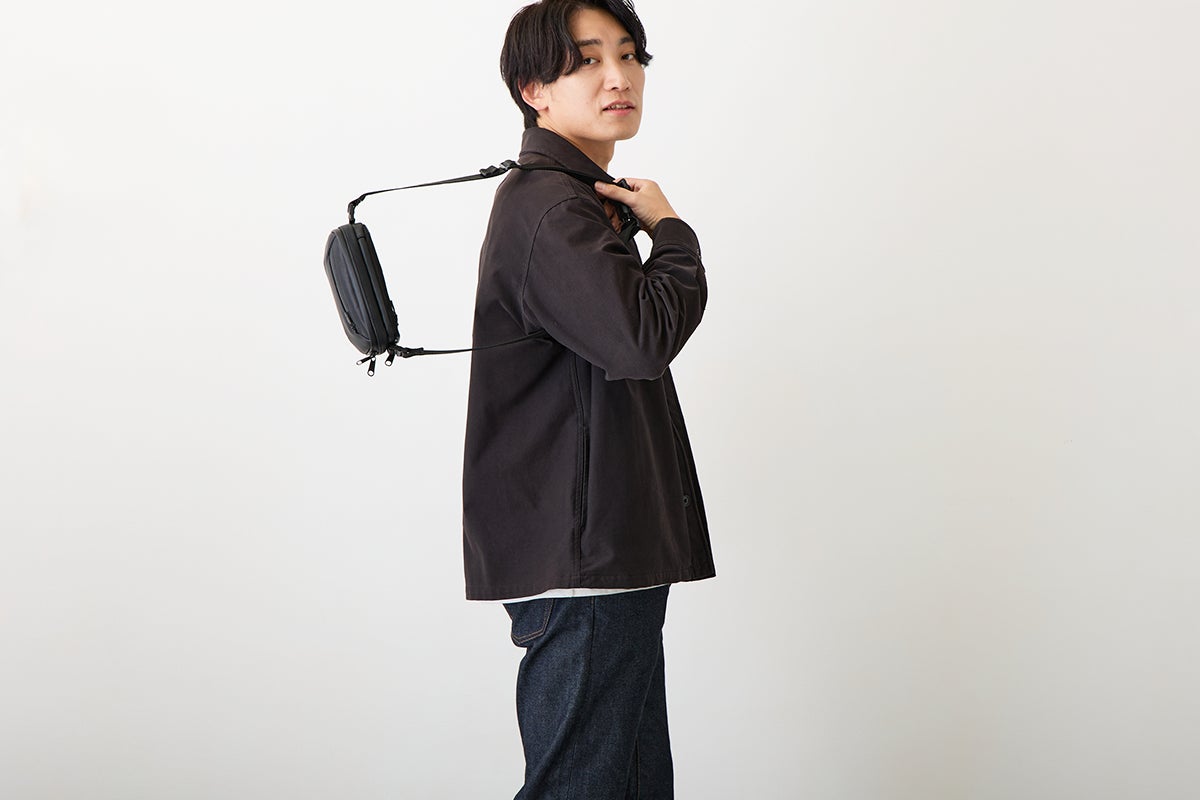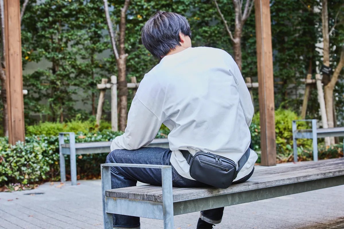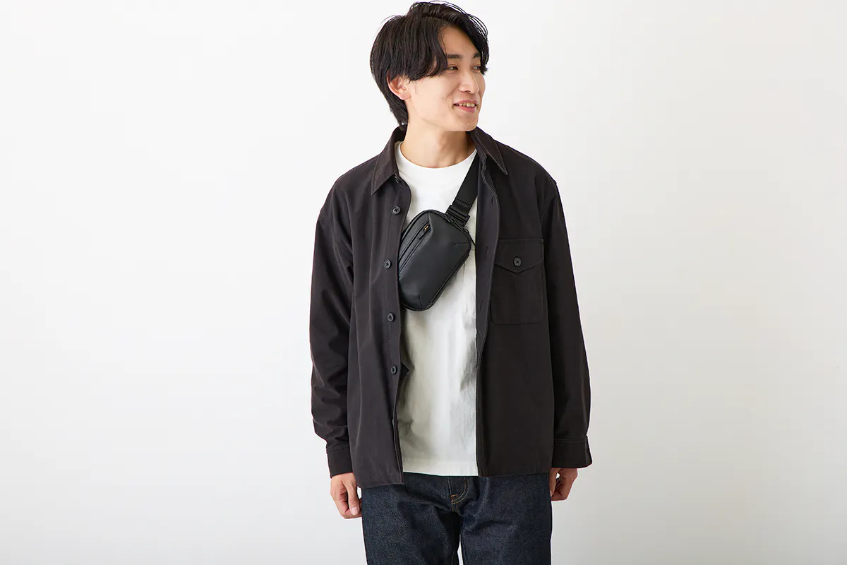 今回のウォータープルーフレザーミニバッグを作ろうと思ったキッカケは、デザイナーでもある私自身が30代中盤になり、これまで休日に好んで使っていたアウトドアブランドのナイロン製のミニバッグやサコッシュが似合わなくなってきたと感じたことでした。