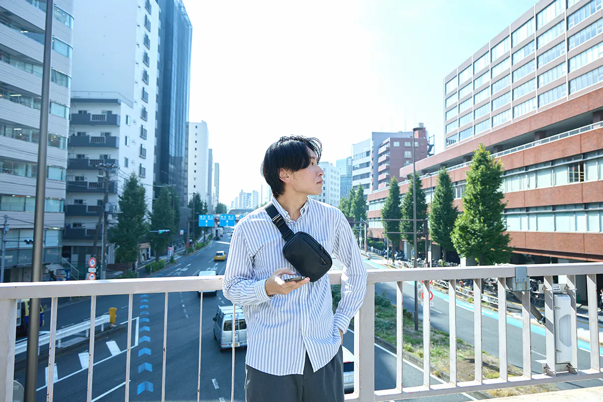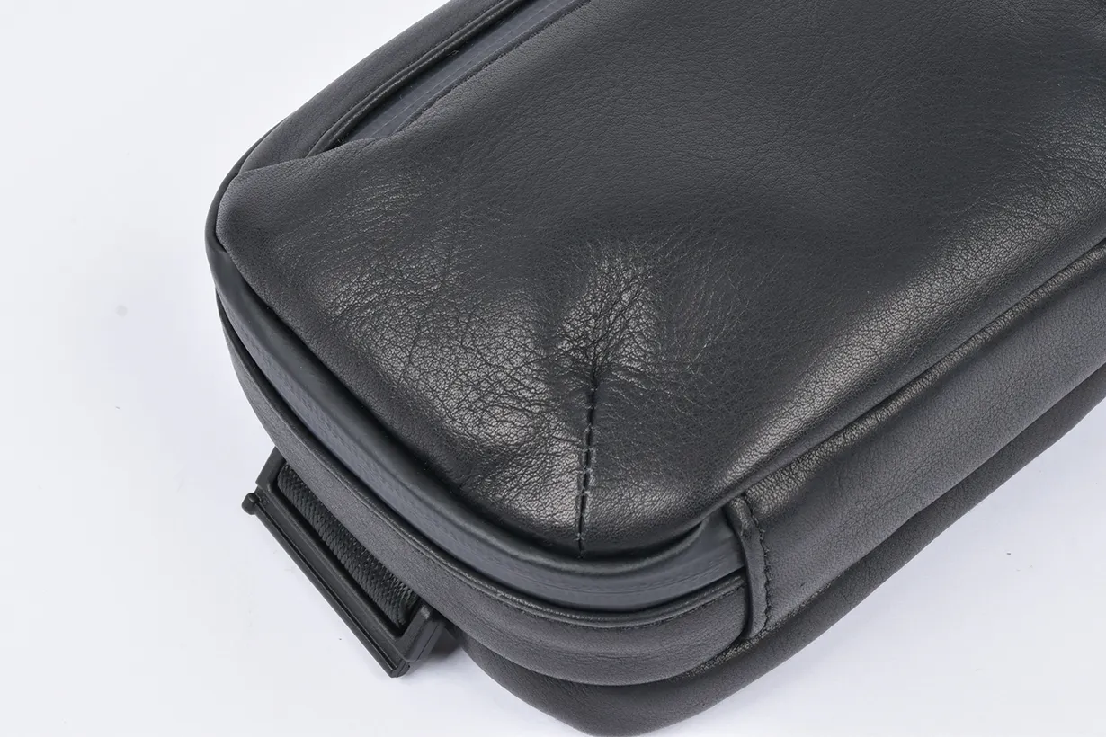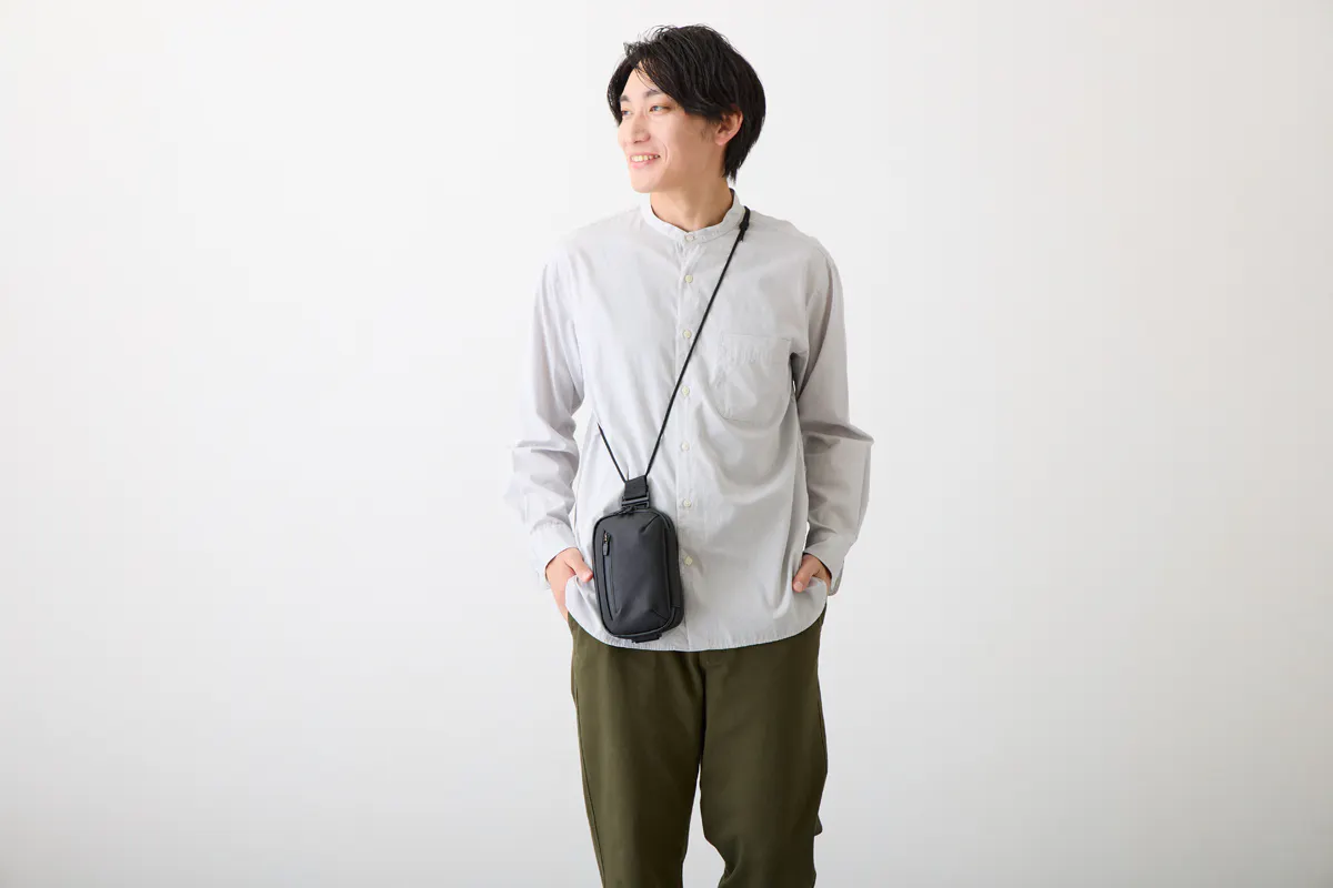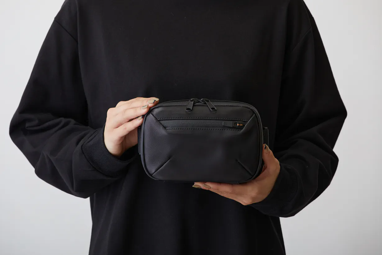 今回のウォータープルーフレザーミニバッグを作ろうと思ったキッカケは、デザイナーでもある私自身が30代中盤になり、これまで休日に好んで使っていたアウトドアブランドのナイロン製のミニバッグやサコッシュが似合わなくなってきたと感じたことでした。