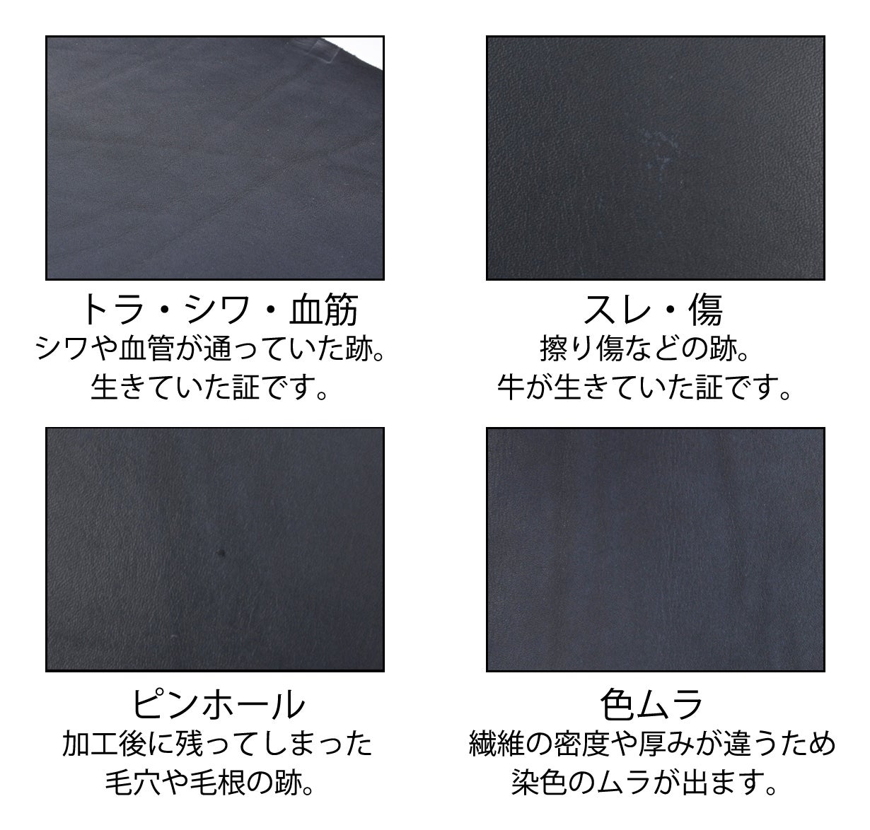 本来革が持つ傷やスレ、色ムラなどが表面に出る可能性が有りますが革の特性としてお楽しみください。