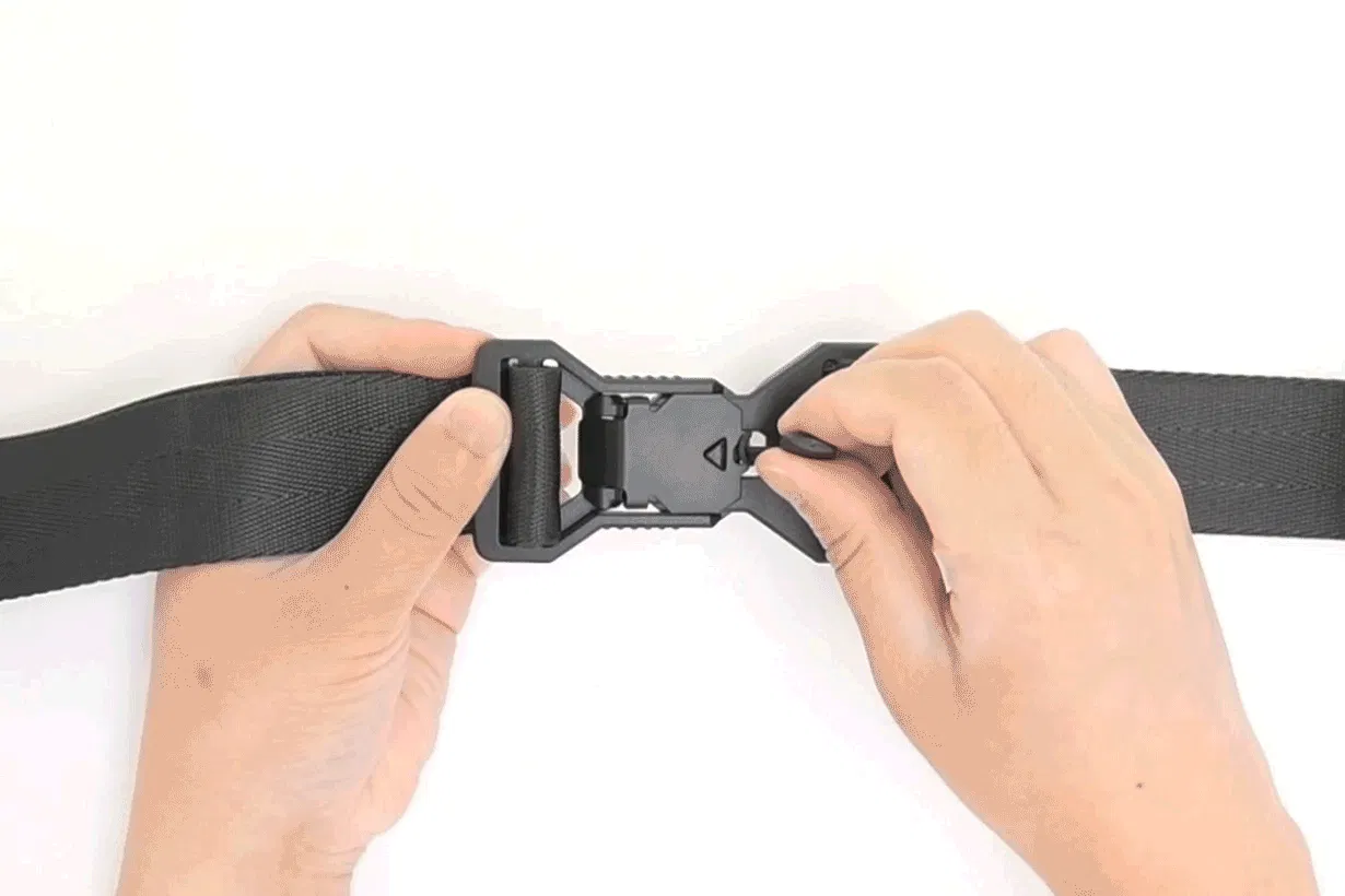 従来のバックルの様に力を入れなくても簡単に脱着出来るバックルになっております。