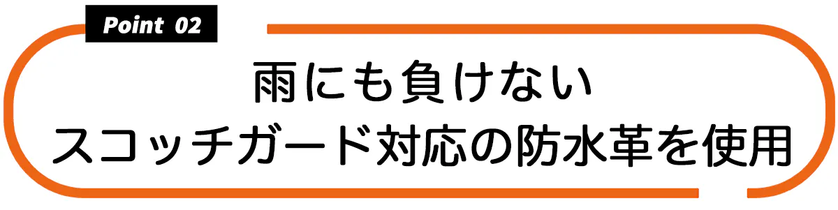 この商品には一般的な表面のみに撥水加工された革ではなく、革内部の繊維まで防水性を持たせたスコッチガード皮革保護加工された防水本革を使っています。