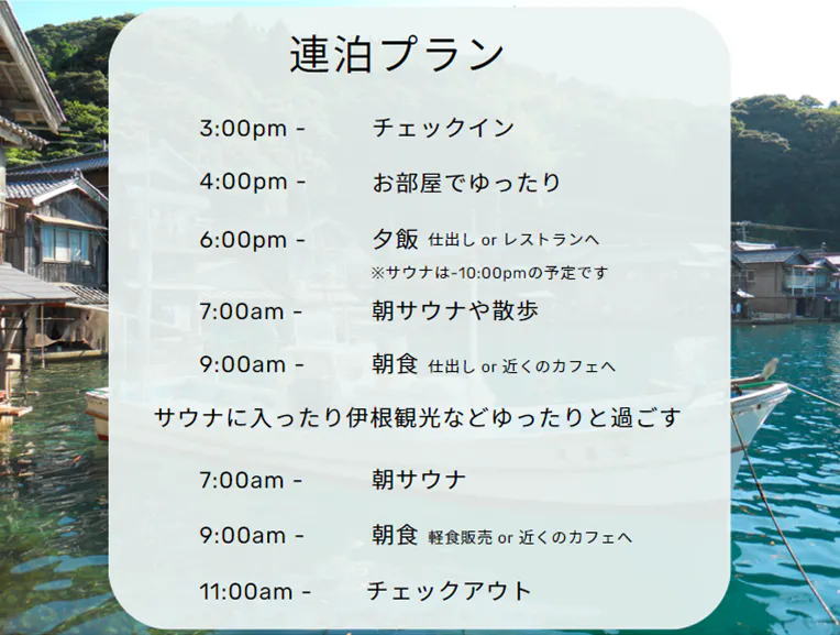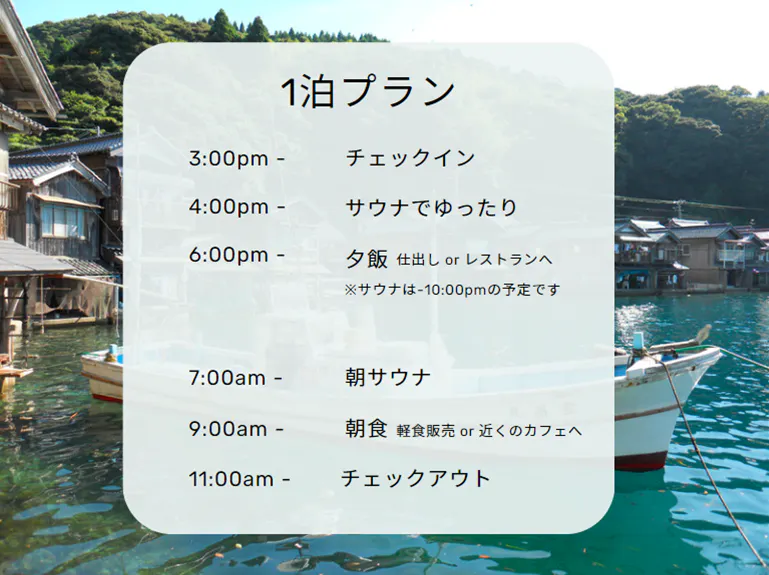 伊根の一棟貸しの施設では2名様からのご利用が多いですが、自分と向き合い無になる時間を提供したいという想いから1名様からでもご利用していただけるプランを考えています!