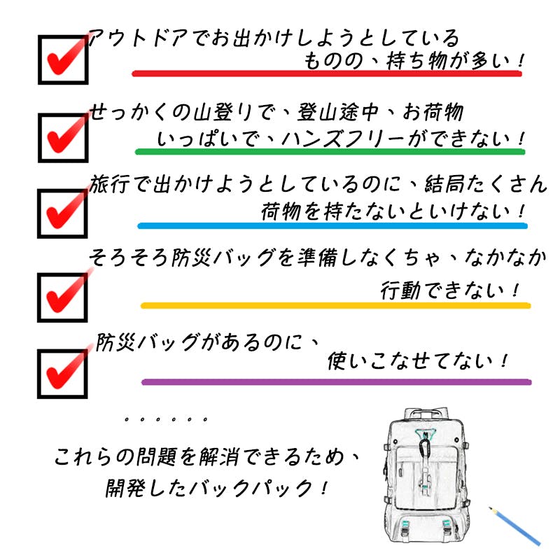 普段アウトドアで使いこなせして頂けることで、使わない時に、ご準備された防災用具や貴重な書類などを入れて頂くより、災害時にすぐ対応できるように、このような思いで、開発しましたリュックバッグです。