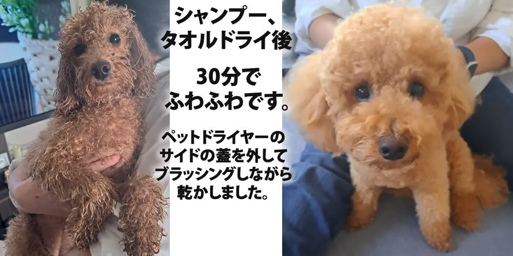 シャンプー後こちらのタオルで軽くふいて水気を取ってからペットドライヤーに入れてみて下さい。