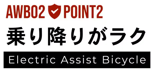 AWB02のフレーム形状は乗り降りしやすいデザインになっています。ローイングフレームと呼ばれる形状になっており、上部に跨ぐ必要がないため、乗り降りがとても簡単になっています。さらに、フレームが低くなっているため、足付きもよく、女性や年配の方でも安心して乗車することができます。