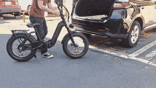 具体的には、フレームの中央にあるヒンジを開いてペダルを折りたたみ、ハンドルバーを前に倒し、さらにフレームを中央で折りたたむことで、自転車の大きさを約半分にまで縮めることができます。折りたたみ後のサイズは、約幅約55cm×高さ80cm×奥行約80cmとなり、通勤時の車のトランクに収納する際にも十分にコンパクトになります。