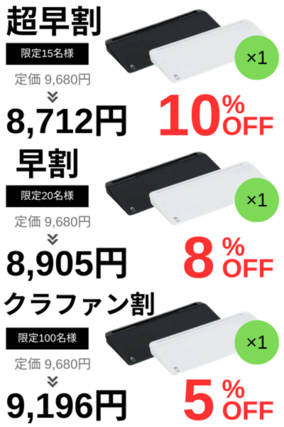 2024/06/13 19:55こんばんは!SK-TRADEの白土です!いつもご支援、応援くださっている皆様、ありがとうございます。前回非常に好評だった、「notera Wedge Lite」ですが、明日、6月14(金)午前10:00〜、CAMPFIREでプロジェクトを再実施します!「前回、購入しそびれた!」という方や「実際に使ってみて、もう1個欲しい!」という方は特に注目です!現在120名の方がお気に入り登録しており、お得なプランから完売が予想されます。ぜひ「お気に入り登録」をして、プロジェクト開始の通知を受け取ってください。https://camp-fire.jp/projects/754964それでは、公開まで楽しみにお待ちください! もっと見る