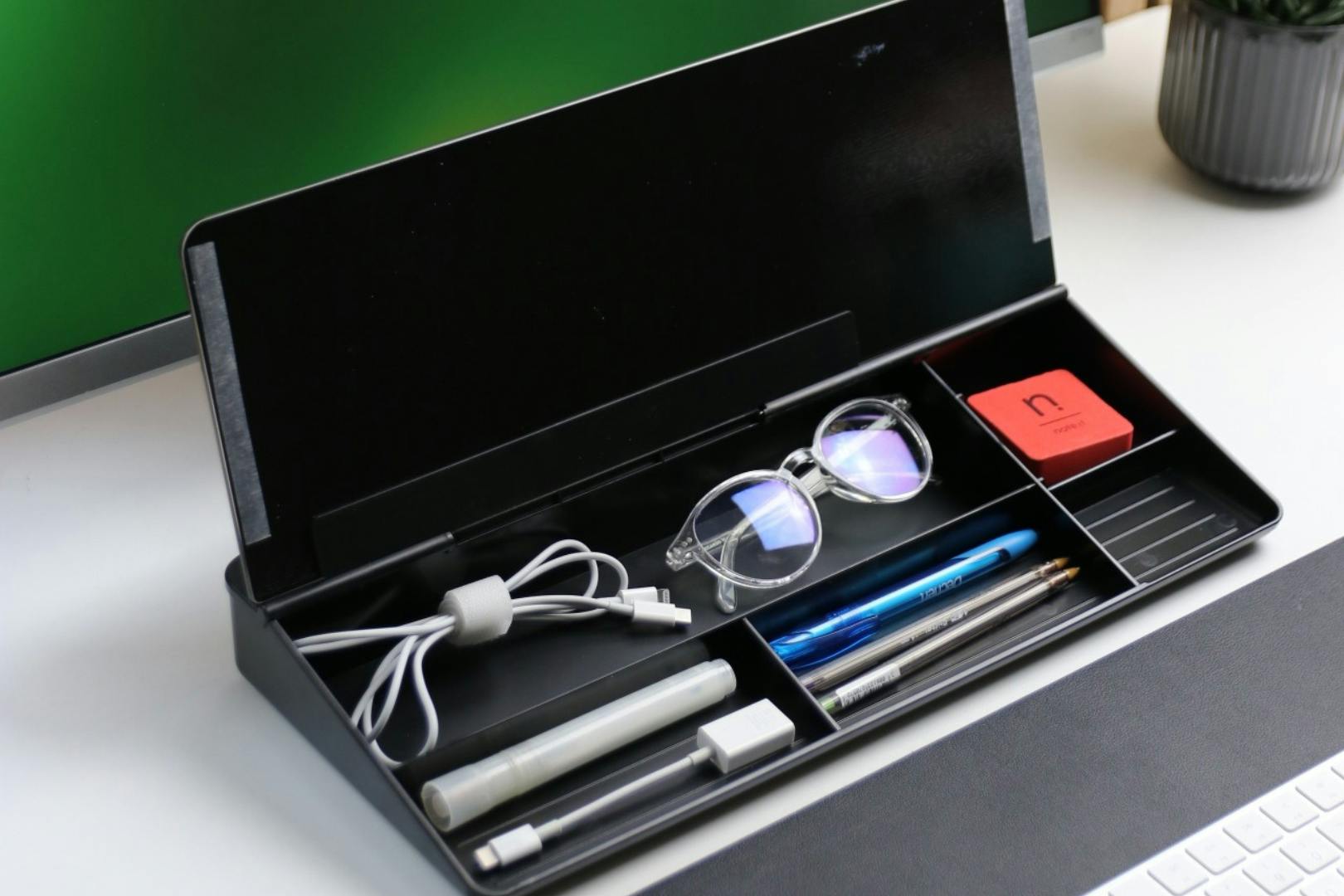 ガラス面の中には筆記用具や充電ケーブルなどの小物を収納するのに適したスペースがあります。