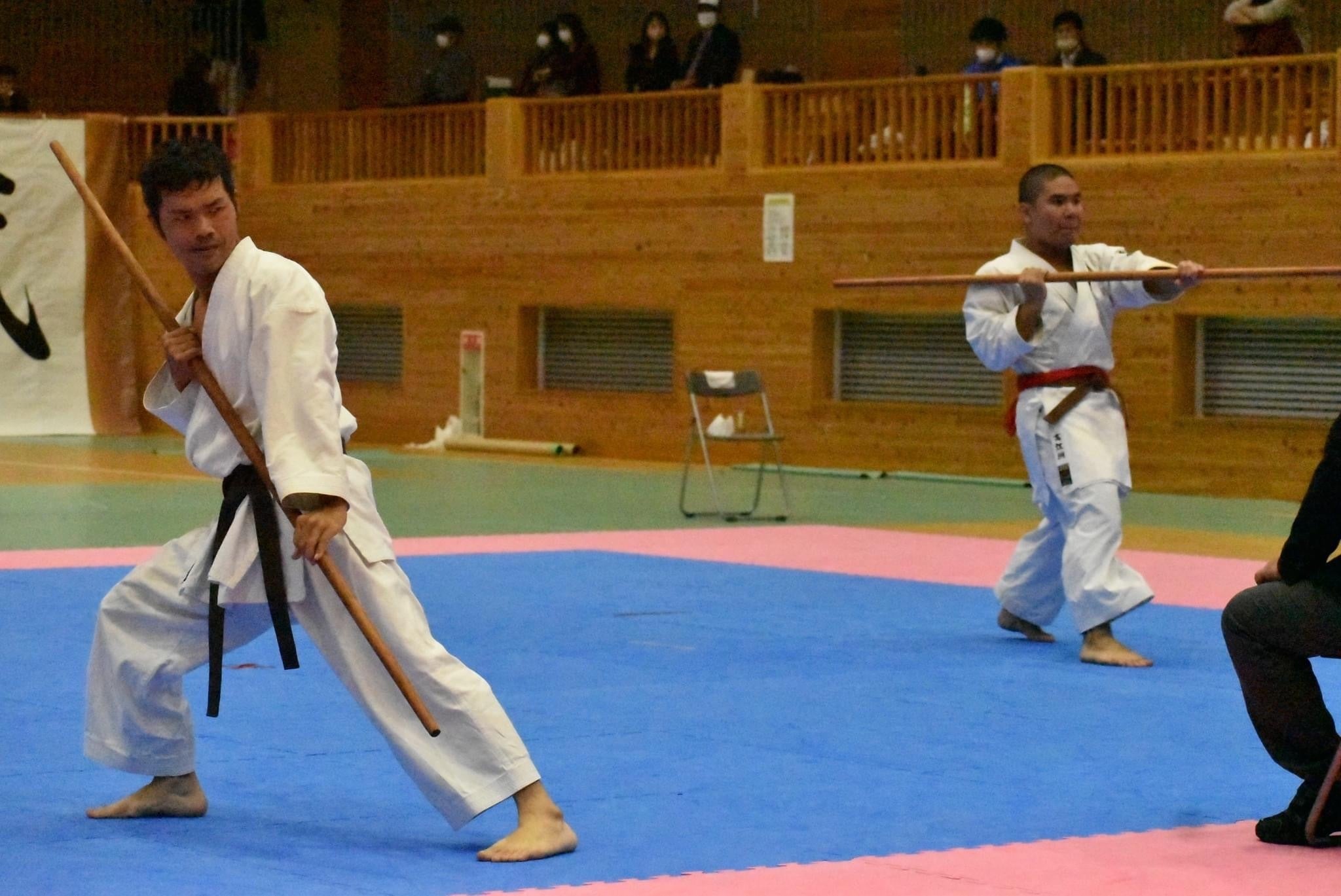 また、本大会の特徴としては、「棒」での攻撃に加え、徒手技「正拳」と「蹴り」による攻撃を認めるルールを採用した、「実戦琉球古武道組手」のトーナメントを行なっています。この競技は沖縄では本大会のみとなっており、東京では全日本琉球古武道選手権(一般社団法人全日本琉球古武道連盟)にて行っています。