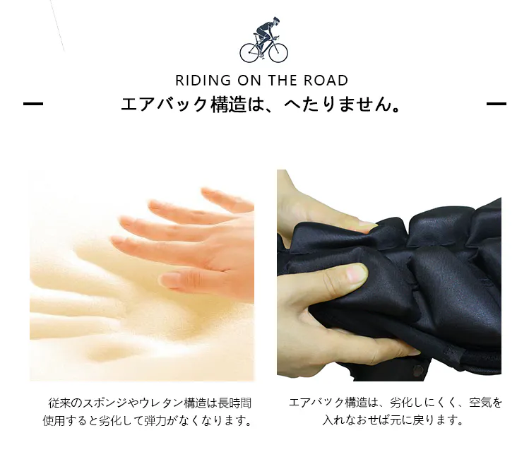 さらに、エアバック構造は、劣化しにくく、空気を入れなおせば元に戻るのでクッション性は常に保ったまま使えます。
