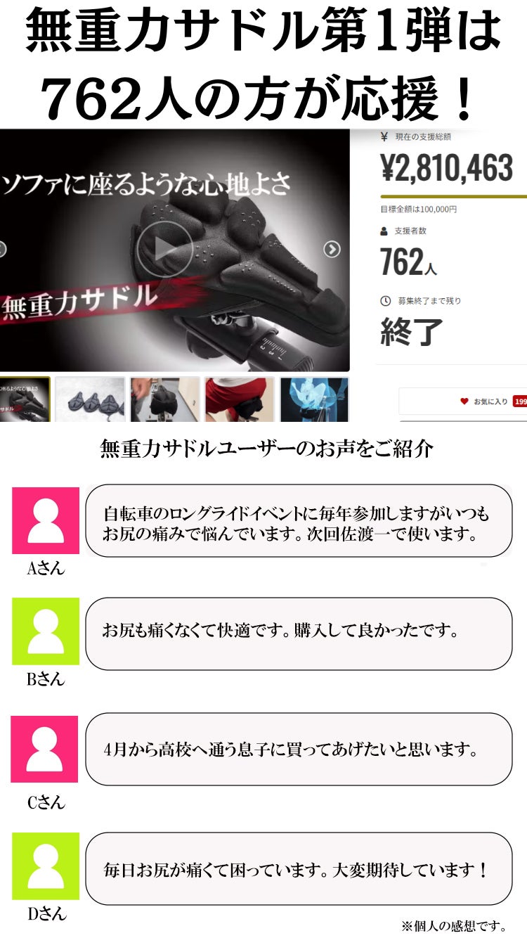 ママチャリタイプのサドルでもお尻の痛みに悩んでいる方にも無重力サドルを届けたいという事で、ばっちり私が試して開発したので是非試してみてください!