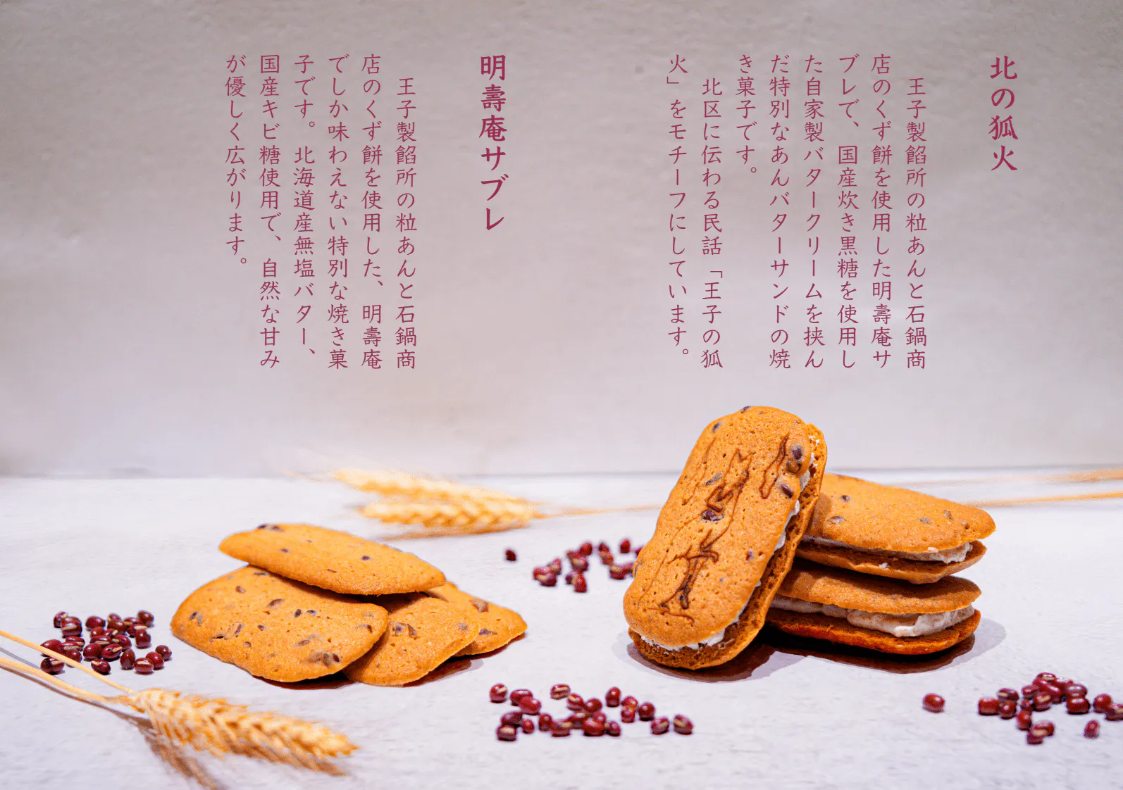 「王子製餡所の粒あんと石鍋商店のくず餅を使用した明壽庵サブレで自家製バタークリームを挟んだ特別なあんバターサンドの焼き菓子です。北区に伝わる民話『王子の狐火』をモチーフにしています。」