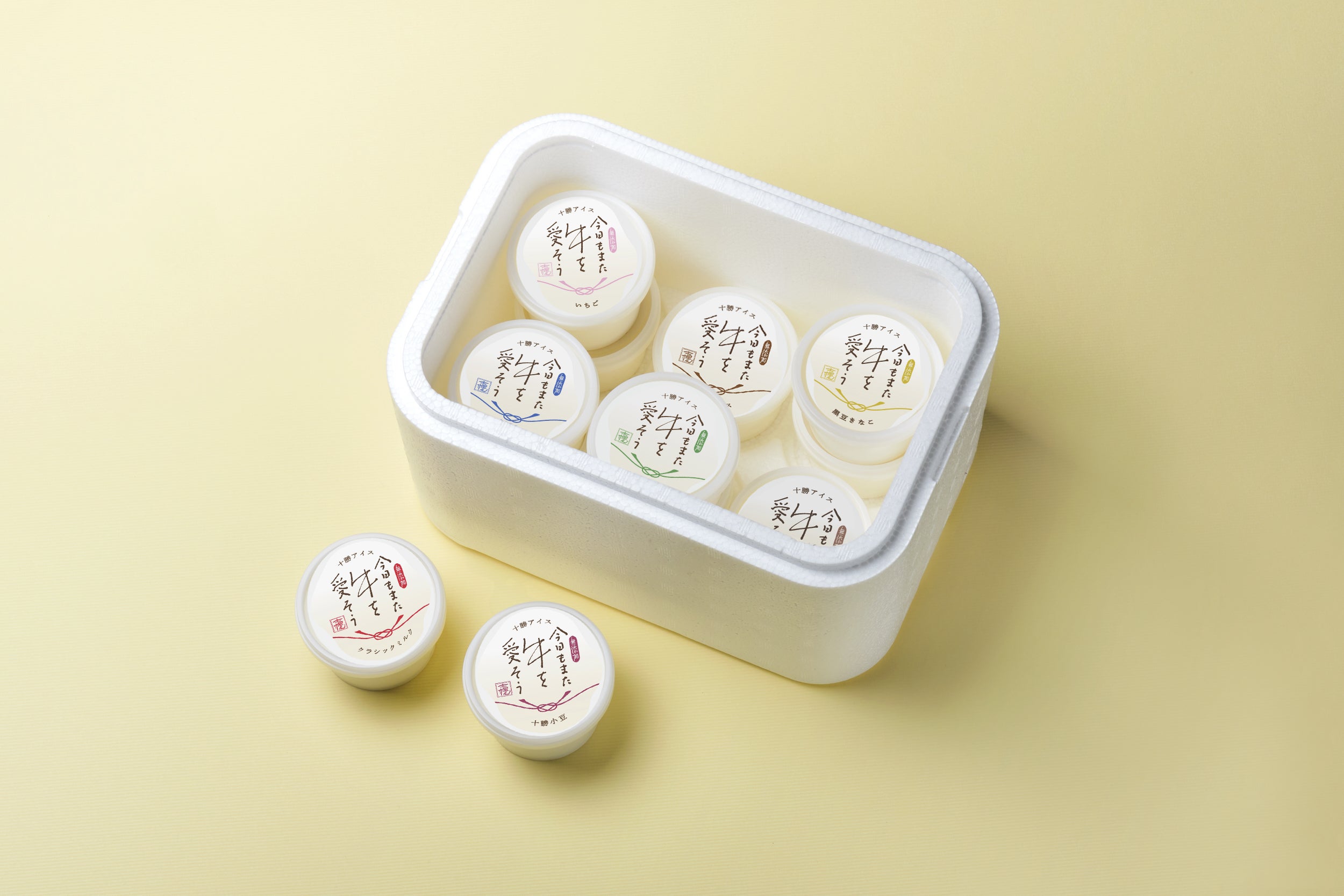 「遠くに住んでいる家族や友達にアイスをプレゼントしたい!」という方にぴったりなのがこちらのプラン。カップアイスとソフトアイスの詰め合わせ12個を、計5箇所に送ることができるプランです。「今日もまた牛を愛そう」は、誰かへの贈り物にもぴったりなアイス。