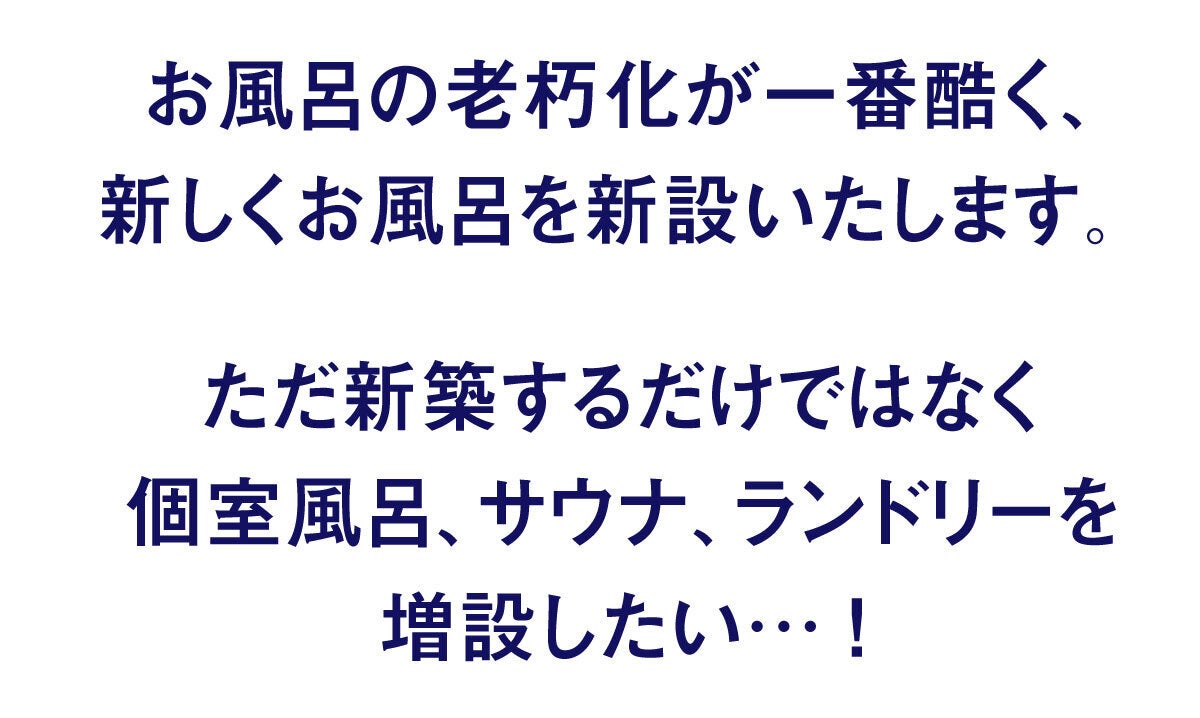 ただ新しくするだけでは、新規のお客様に繋がらないと考え一般のお客様にも快適にお過ごしいただけるよう個室風呂とサウナを、現在簡易的なコイン式ランドリーを使用いただいてる現状なので、ランドリー部分をしっかり屋根付きで増設しようと思い至った次第でございます。コロナ渦による建築資材の高騰によりリスクは上がりましたが、実現させたいと思います。