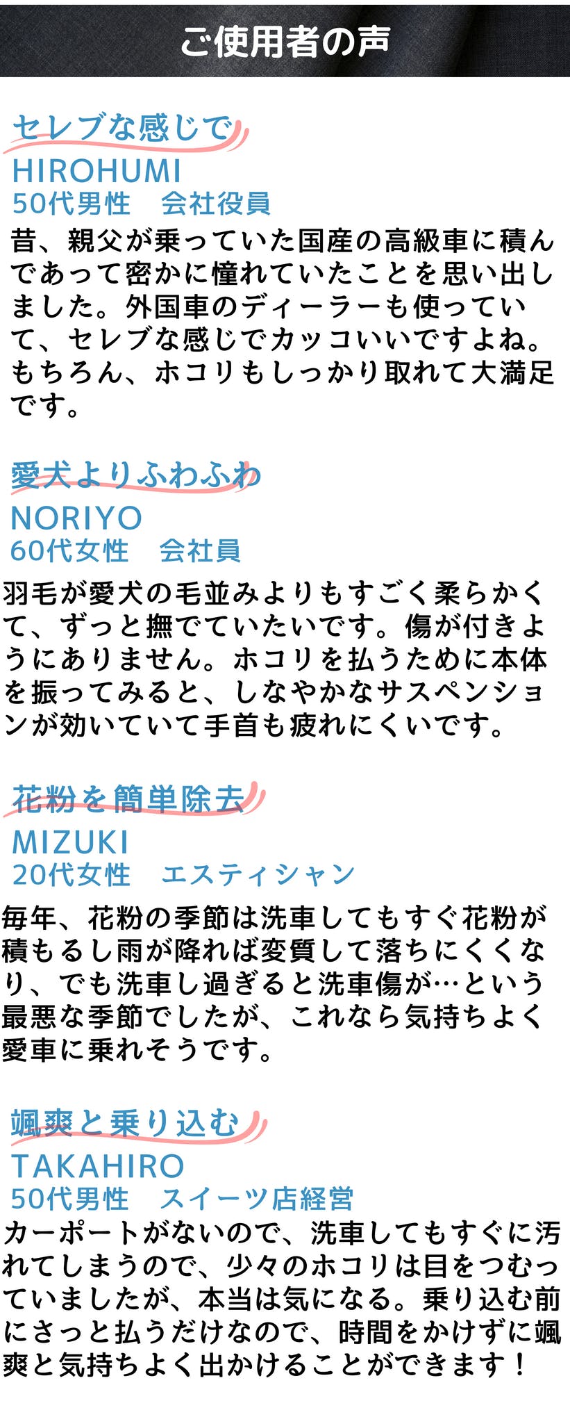 実は、私は車で外出する時は、このフェザーダスター(本商品)を取り出して、1〜2分でパパッとホコリを払ってから颯爽と愛車に乗り込みます。