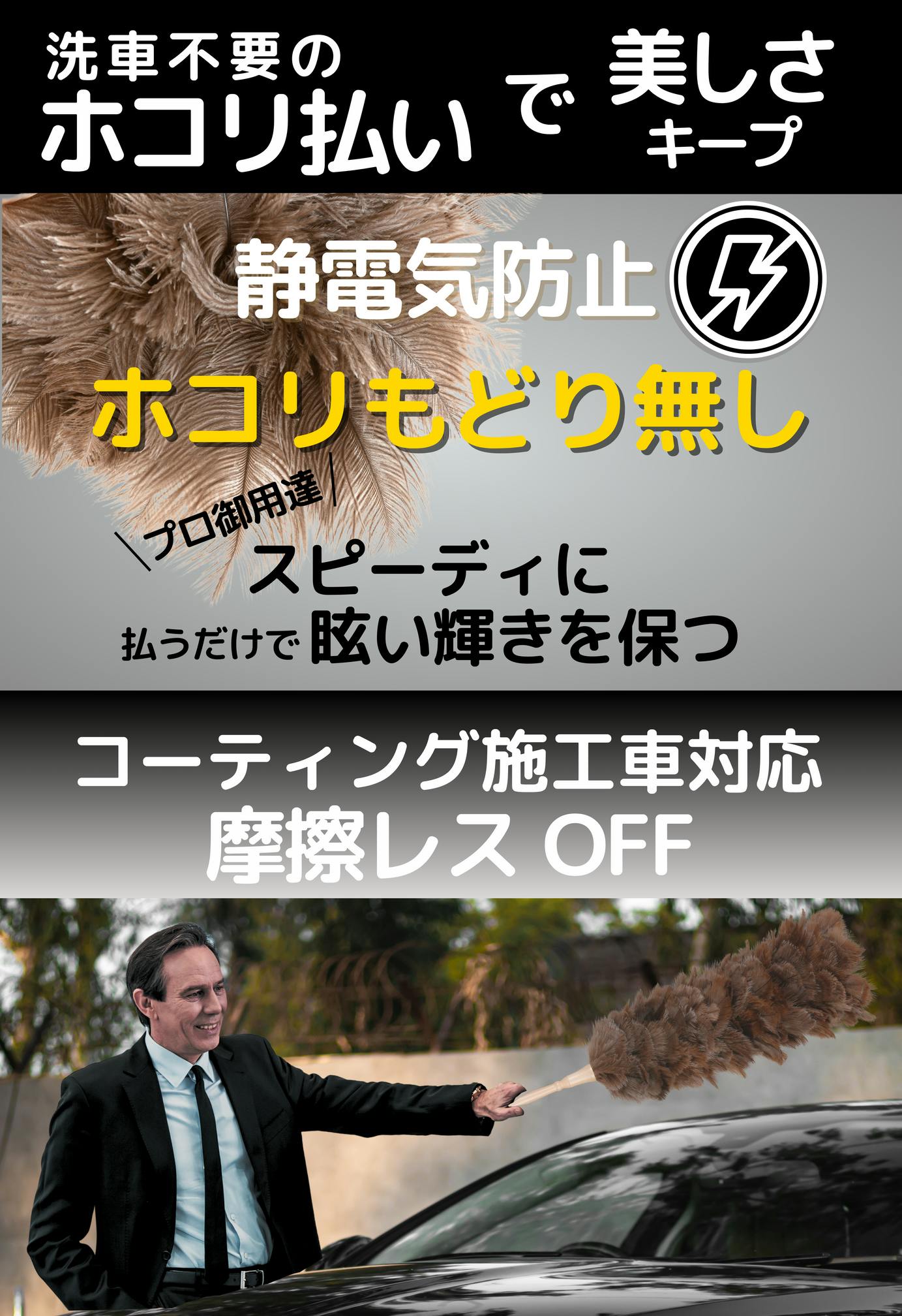 ・本格的なコーティング施工直後のボディは、塗装面が強く擦られた事によって想定以上の静電気が発生してしまい、羽毛が張り付くなどの影響を受ける場合があります。その場合は、静電気が収まるまで、しばらく経ってからご利用ください。