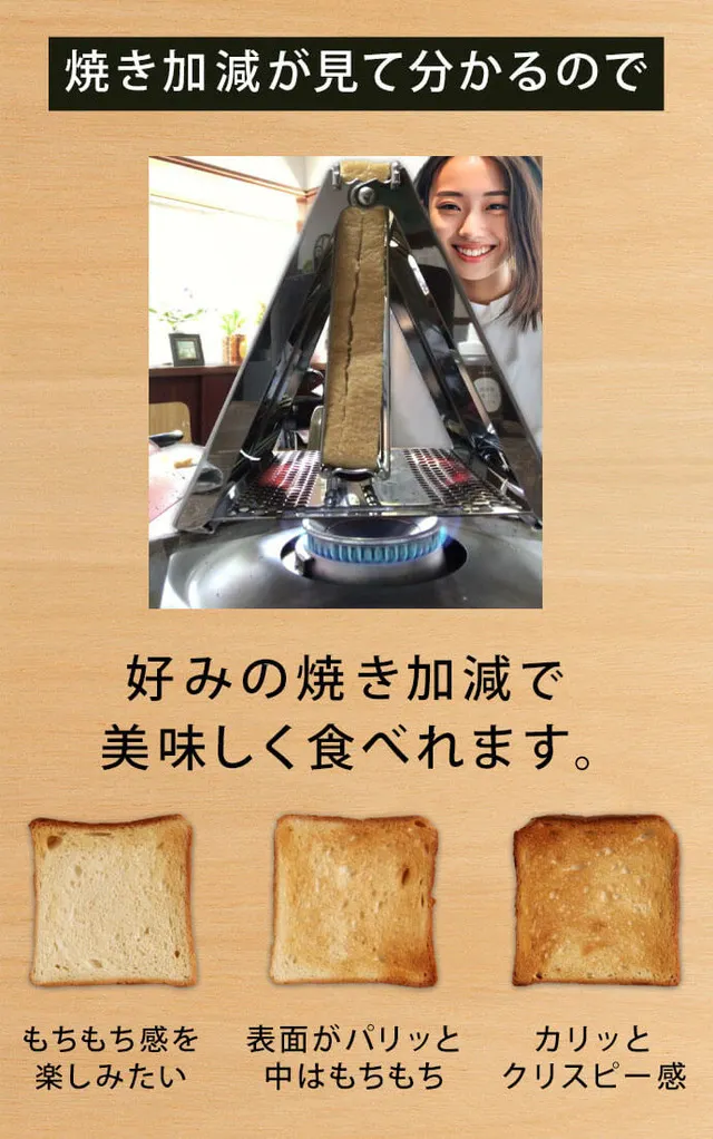 焼き加減が見て分かるので、「もちもちの食感が好きな人」「表面がパリッと中はもちもち」「カリッとクリスピー食感」と、お好みの焼き加減で、香ばしい薫りと食感を味わうことができます。
