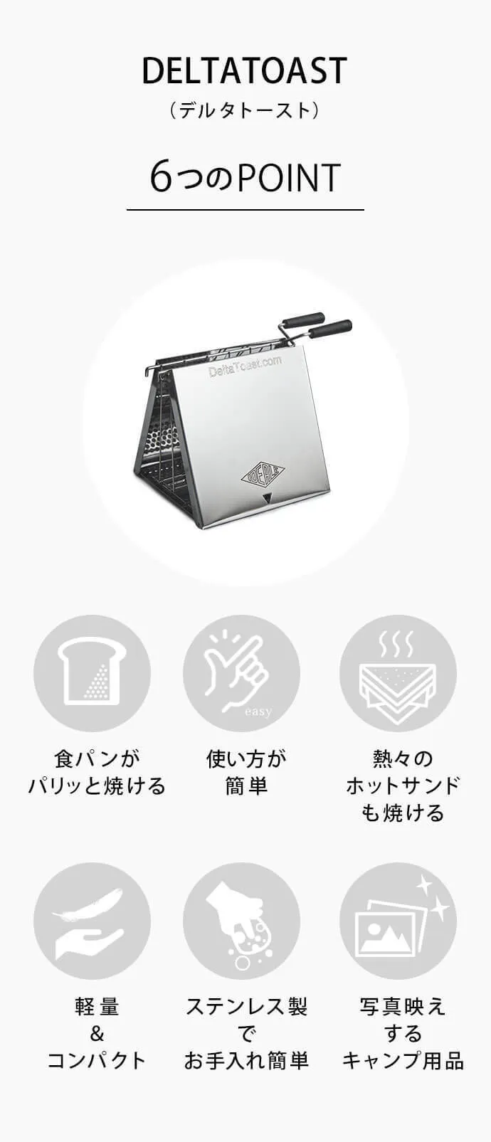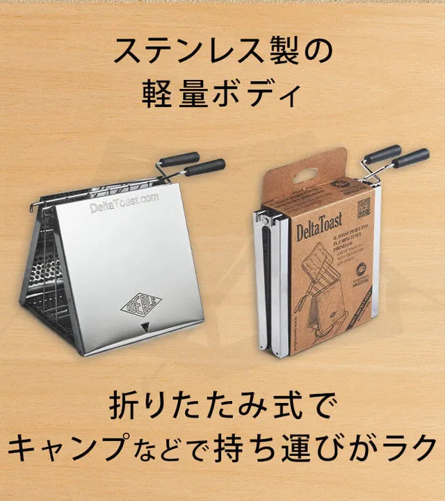 DELTATOASTは、ステンレス製の軽量ボディで、折りたたみできるコンパクト設計。