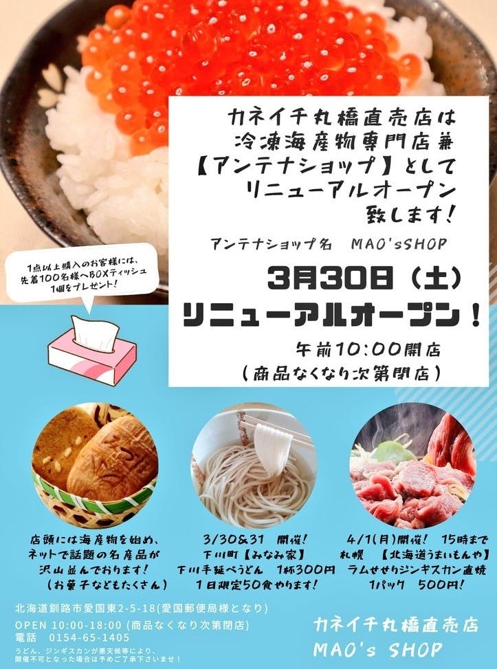 沢山の皆様に愛されているカネイチ丸橋直売店の商品は残したまま、そしてさらには進化した商品も携え、【カネイチイズム】を継承したアンテナショップにしたいのです!お願いします、僕にこの場所で!北海道釧路市カネイチ丸橋直売店で!海産物専門店兼アンテナショップとして開業させて下さい!