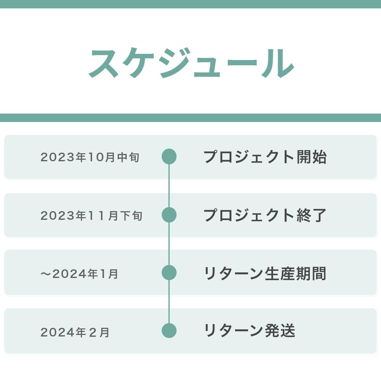 ●引渡し時期: 各リターン詳細に記載の発送予定月を引き渡し時期とします。但し、開発・生産状況によって遅れが生じる場合がありますのでその際は当プロジェクトページ内の「活動報告」または購入者へのメール等で連絡します。