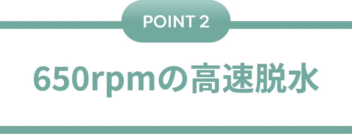 従来の卓上洗濯機の2~3倍の回転数となる、1分間に650回転の高速脱水。最大8分間の脱水プログラムで衣類もしっかり脱水できます。