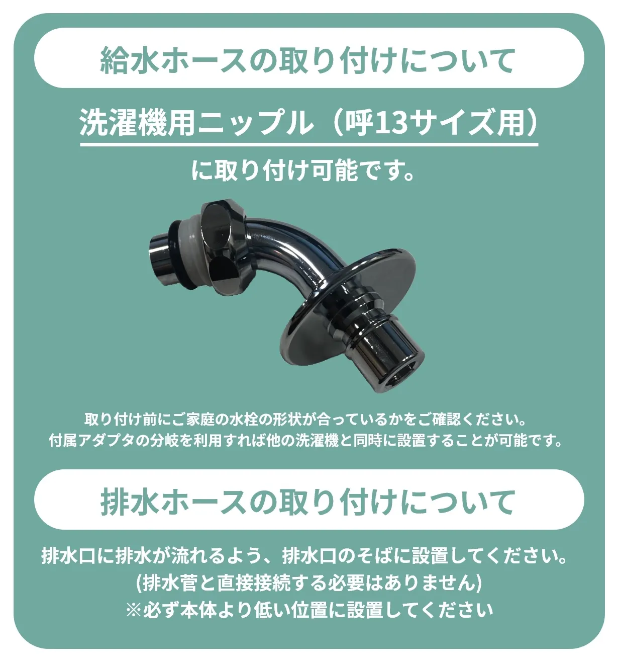 A:洗濯機用ニップル(呼13サイズ用)に取り付け可能です。