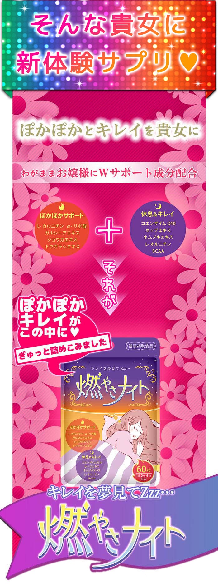・原材料:コーンスターチ(日本製造)、L-カルニチン酒石酸塩、L-オルニチン塩酸塩、デキストリン、ガルシニアエキス末、ホップエキス末、ショウガエキス末、コエンザイムQ10、ネムノキエキス末/セルロース、L-バリン、L-ロイシン、L-イソロイシン、香辛料、ステアリン酸カルシウム、微粒二酸化ケイ素、セラック